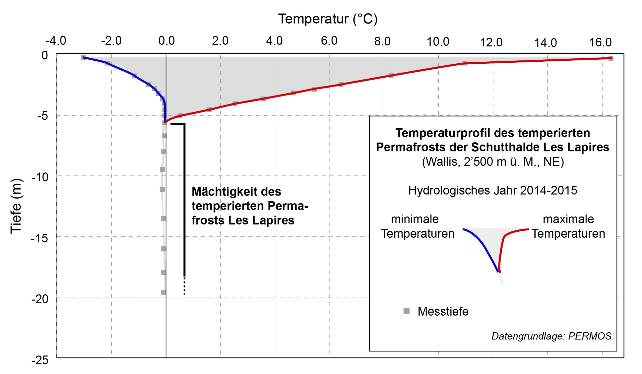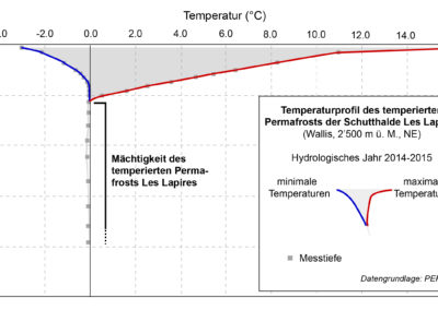 Abb. 4: Ein Beispiel für temperierten Permafrost: die Schutt-/Geröllhalde Les Lapires (Val de Nendaz, VS) (Datenquelle: PERMOS).