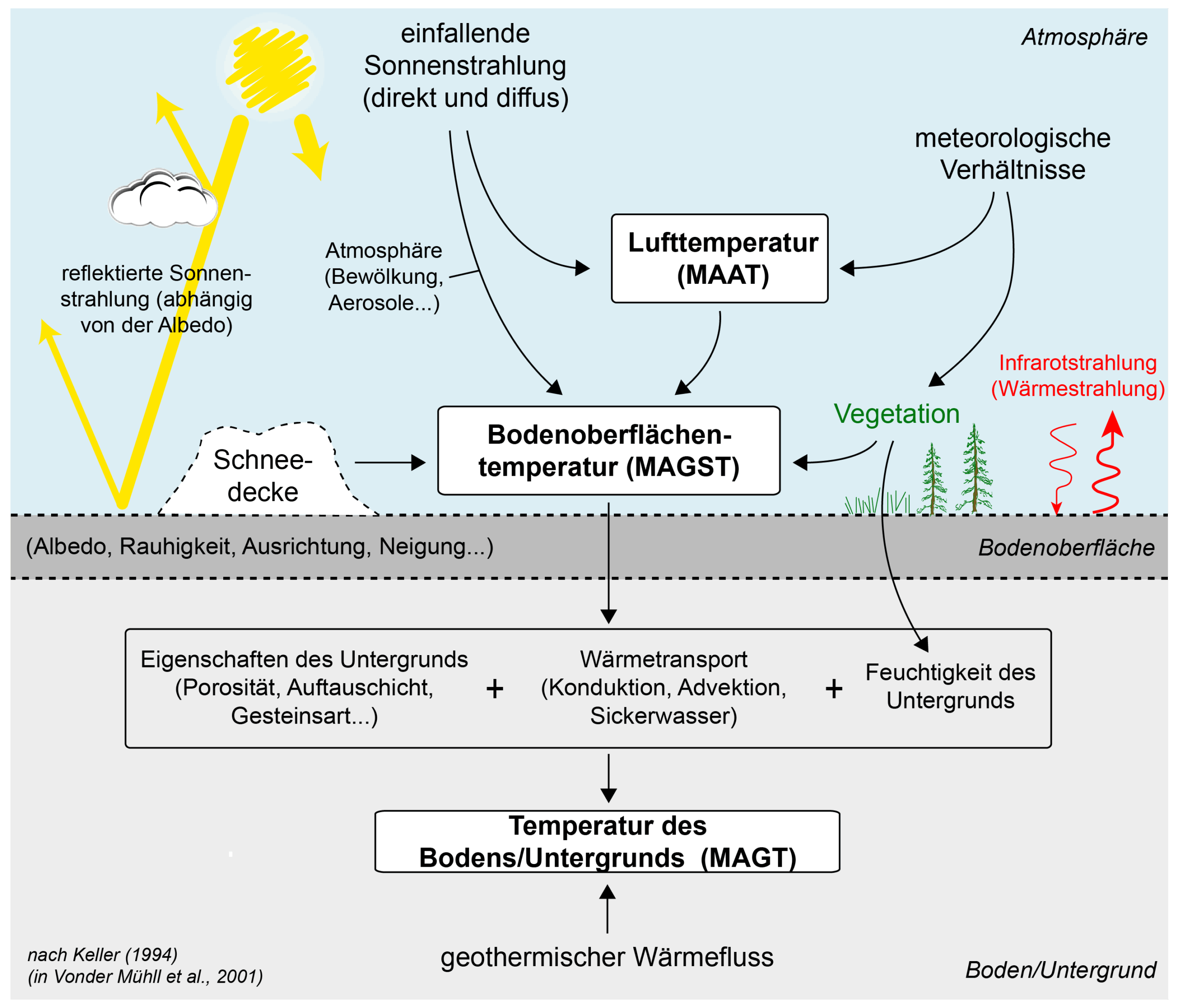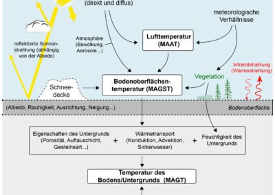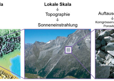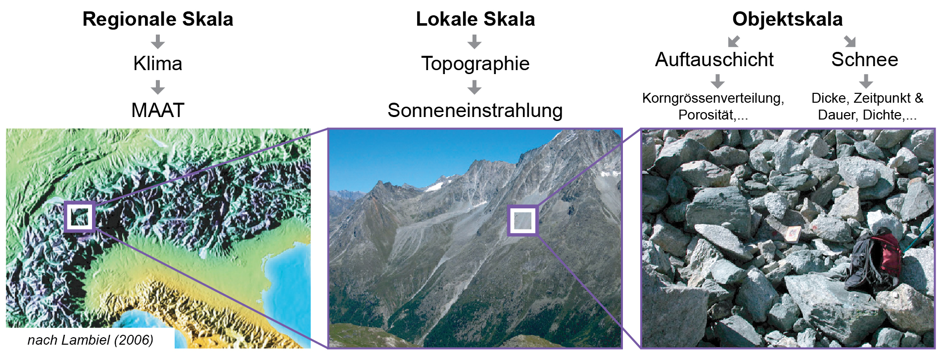 Der wichtigste Faktor, der das Vorhandensein von Permafrost beeinflusst, ist die durchschnittliche jährliche Bodenoberflächentemperatur (MAGST). Diese hängt von mehreren Parametern ab, die auf unterschiedlichen räumlichen Skalen (regional > lokal > Objekt) wirken (Abb. 1 & 2). Die Energiebilanz eines Teils der Lithosphäre wird somit von zwei Gruppen von Faktoren bestimmt.