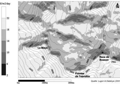 Diese beiden leicht messbaren Faktoren wurden für die ersten Modellierungsansätze der Permafrostverbreitung verwendet (z. B. PermaKart; PermaMap) (Factsheet Permafrost 1.7).