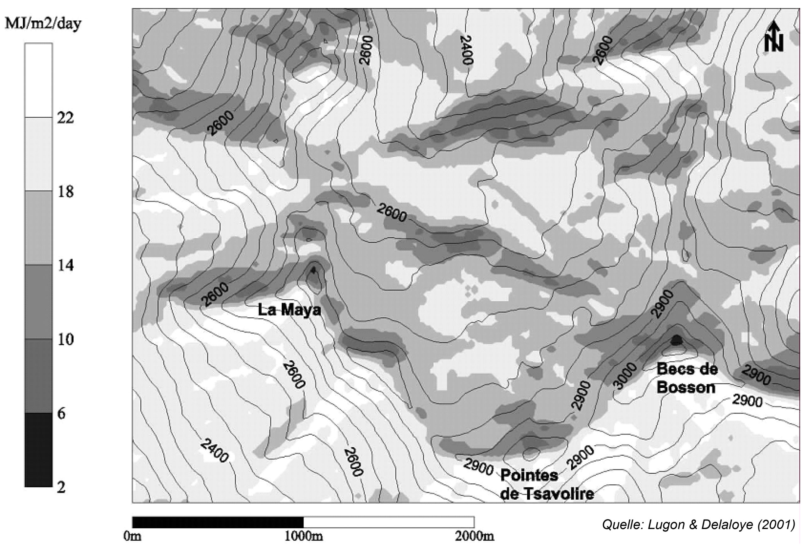 Abb. 3: Heterogene Verteilung der direkten Sonneneinstrahlung im Haut-Vallon de Réchy (VS).