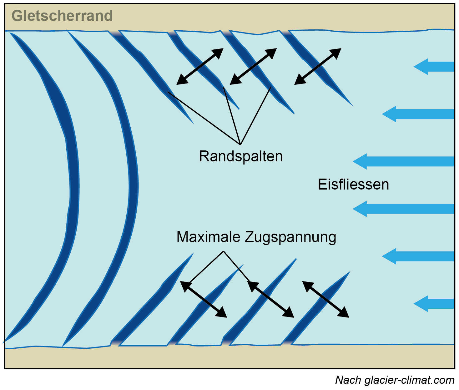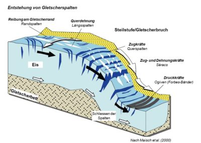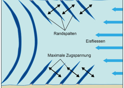 Gletscherspalten sind also Öffnungen, die sich an der Gletscheroberfläche durch die Ausdehnung des Eises bilden (Abb. 1). Ihre Richtung verläuft senkrecht zur Hauptrichtung der Spannung. Sie kommen selten isoliert vor, sondern gruppieren sich zu Spaltensystemen ähnlichen Ursprungs. Man kann unterscheiden zwischen Randspalten (Abb. 2), die bergwärts in einem Winkel von etwa 45° zum Gletscherrand verlaufen und auf Geschwindigkeitsunterschiede zwischen Gletschermitte und -rand zurückzuführen sind, Querspalten, die mit topografischen Diskontinuitäten am Gletscherbett zusammenhängen (Abb. 3), und Längsspalten, die mehr oder weniger parallel zur Fliessrichtung verlaufen und sich in Bereichen mit kompressivem Fliessen bilden, was eine seitliche Ausdehnung des Eises zur Folge hat. An der Oberfläche von Gebirgsgletschern schliessen sich die Spalten, wenn das Eis in ein Gebiet mit kompressivem Fliessen gelangt.