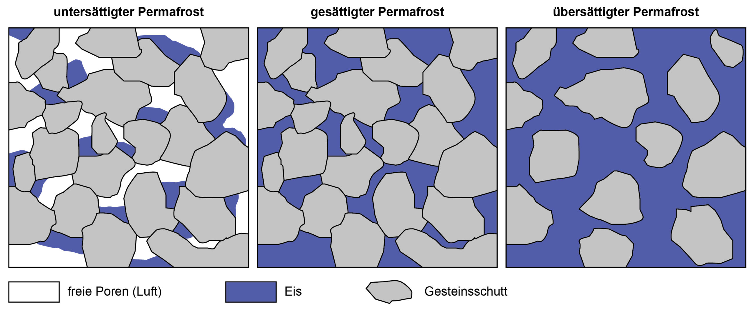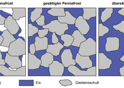 Permafrost wird als gesättigt bezeichnet, wenn das Eis die Hohlräume zwischen den festen Komponenten genau ausfüllt, und als untersättigt (bzw. übersättigt), wenn das Eisvolumen kleiner (bzw. grösser) als das Volumen dieser Zwischenräume ist (Abb. 2). Im Falle einer Eisübersättigung kann sich der Permafrost in Bewegung setzen (creeping) und einen Blockgletscher entstehen lassen (siehe Factsheet Permafrost 3.4).