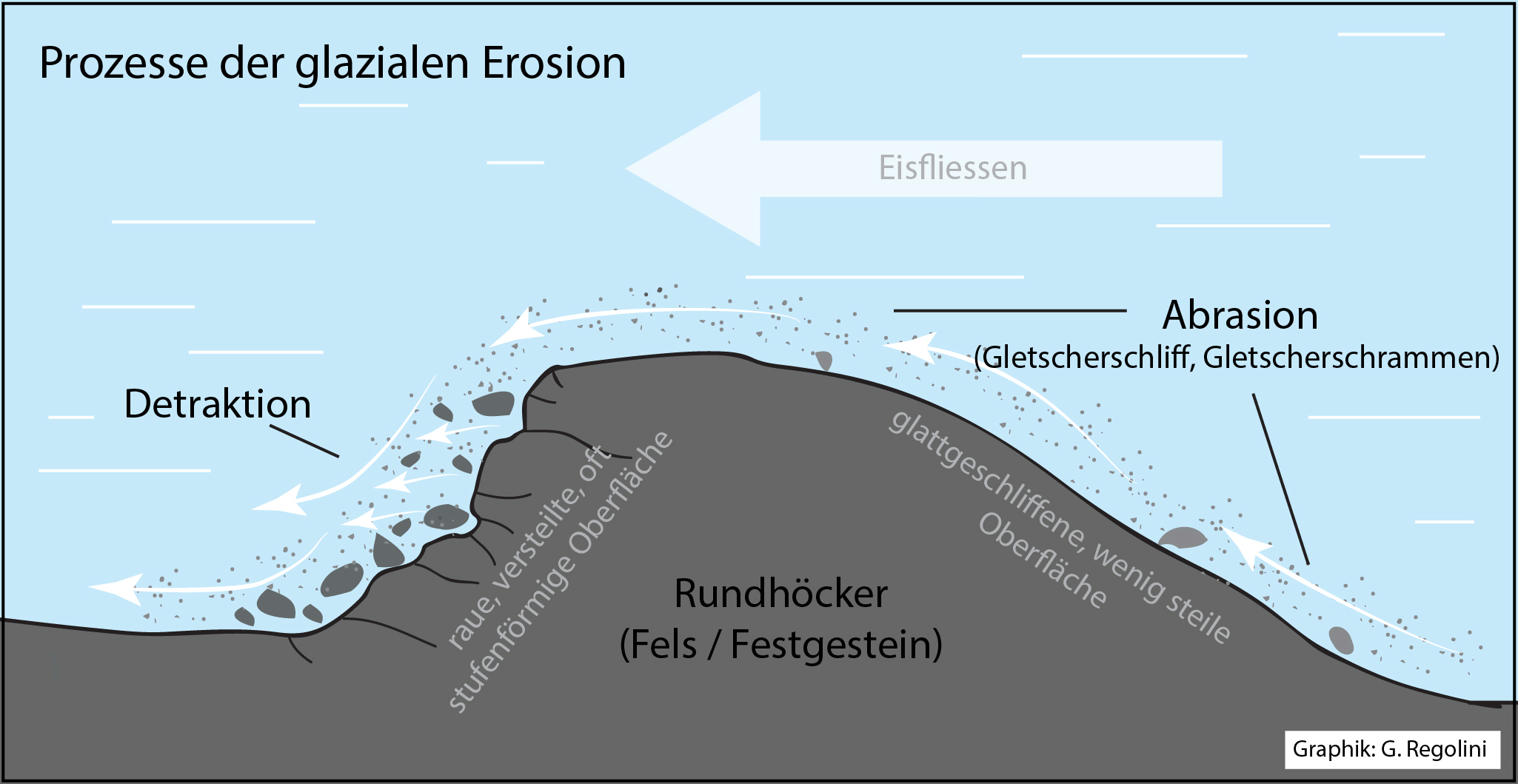 Man unterscheidet drei Gruppen von Erosionsprozessen: Abrasion, Detraktion und fluvioglaziale Erosion (Abb. 1). Die mechanische Abrasion ist das Ergebnis der fliessbedingten Reibung am Gletscherbett von materialbeladenem Eis auf Festgestein; sie erfolgt auf zwei Arten: Gletscherschrammen, kleine Rillen oder Kratzspuren (Tiefe im Millimeterbereich) auf der Gesteinsoberfläche, die parallel zur Fliessrichtung durch im Eis eingefrorene Steine entstehen, und Gletscherschliff, der durch relativ gleichmässiges Abschleifen des Gesteins durch die Reibung der Gletscherbewegung entsteht. Gletscherschliff überwiegt dort, wo der Härteunterschied zwischen den im basalen Eis und im Grundgestein enthaltenen (Gesteins-)Materialien gering ist. Das Losreissen/Herauslösen von Material aus dem Festgestein am Gletscherbett (mechanische Erosion durch Detraktion) ist die zweite Art von glazialen Erosionsprozessen. Der Gletscher reisst Stücke aus dem Felsbett heraus, die in die Grundmoräne eingearbeitet werden. Rundhöcker sind eine weit verbreitete Form der glazialen Erosion, die aus der Kombination dieser beiden Prozesse (Abrasion und Detraktion) entstehen (siehe Factsheet Glazialmorphologie 2.2).