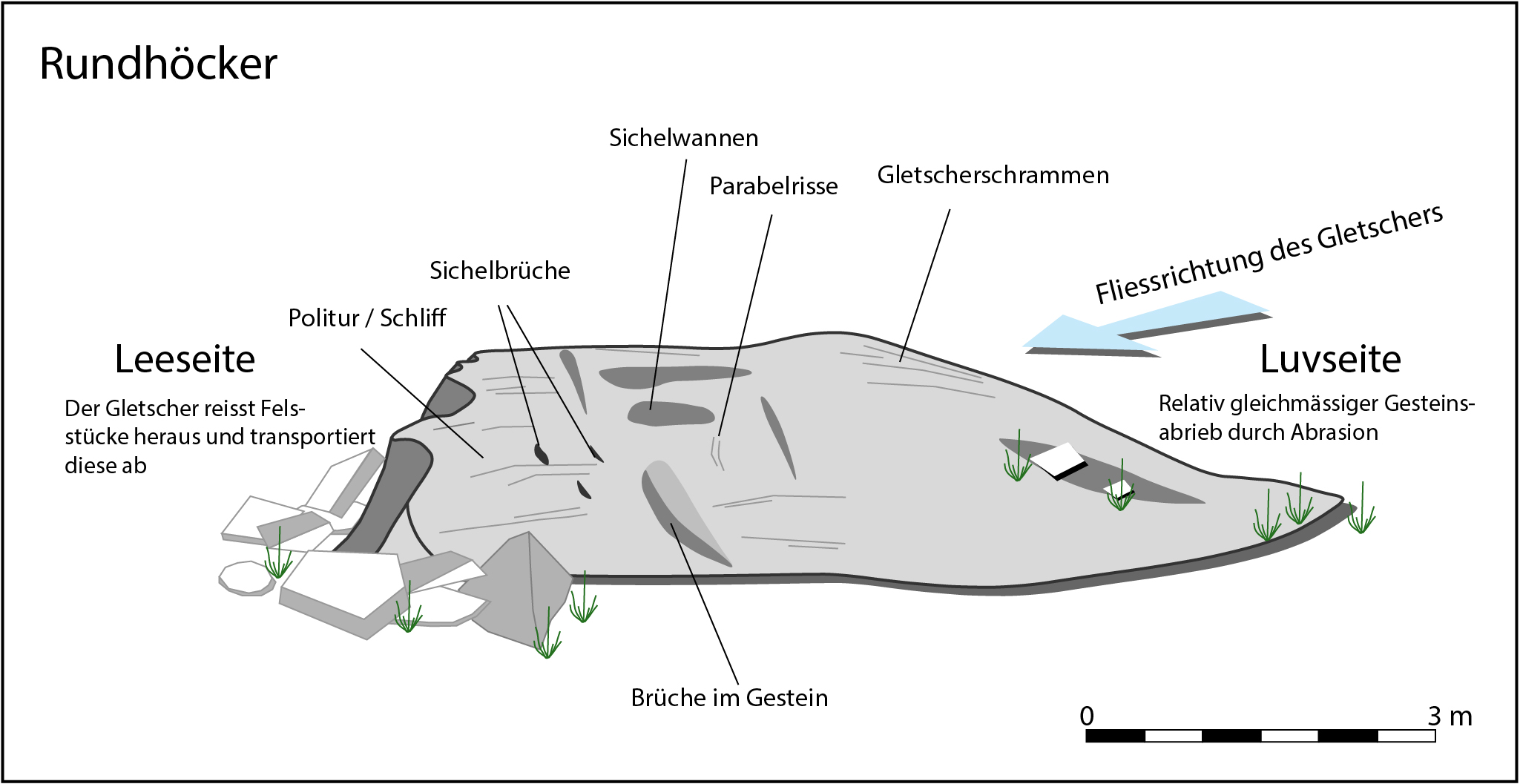 Abb. 1: Asymmetrie der Rundhöcker (roches moutonnées) durch Abrasion bergwärts (Luv-Seite) und Detraktion