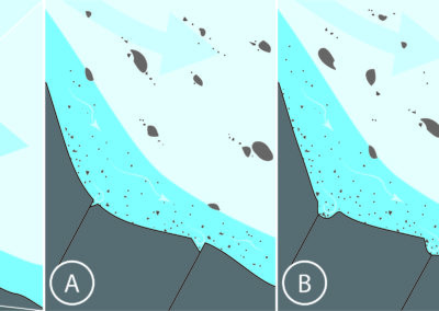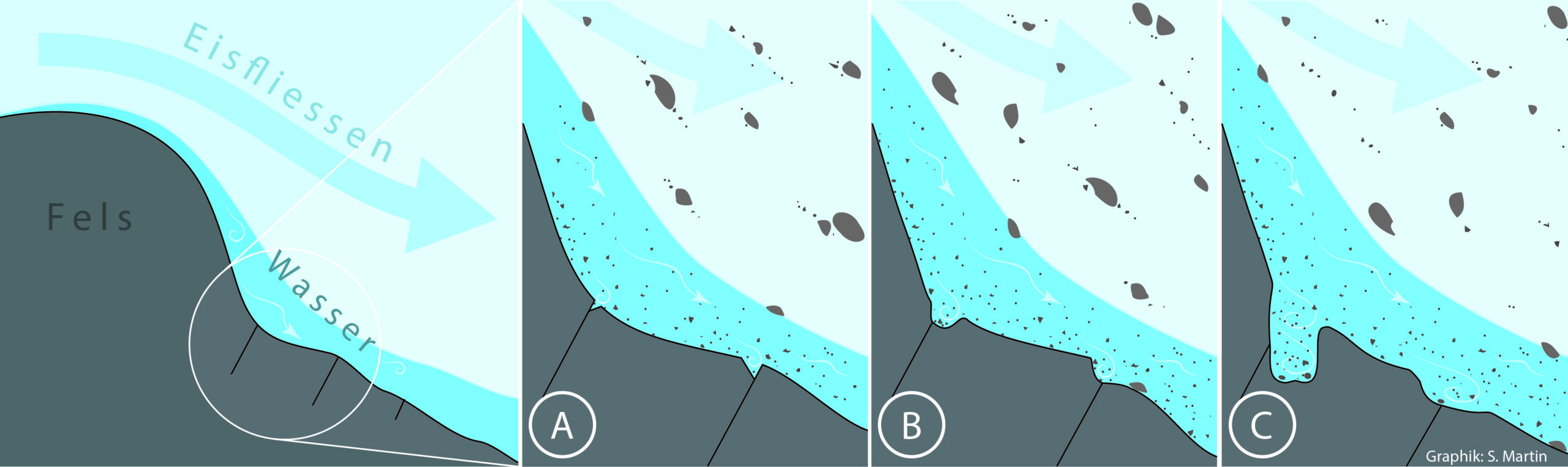 Abb. 6: Phasen der Entstehung eines Gletschertopfes durch sedimentbeladenes, unter Druck stehendes Schmelzwasser am Gletscherbett.