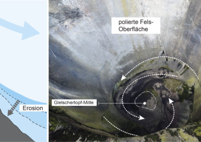 Auf mittlerer Skala (Hang) stellen die Rundhöcker (auch roches moutonnées), ein Begriff, der von Horace-Bénédict de Saussure im Chamonix-Tal eingeführt wurde, die wichtigste glaziale Erosionsform dar (Abb. 1-3). Sie sind das Ergebnis von Abrasions- und Detraktionsprozessen. Rundhöcker sind glatt und haben eine asymmetrische Form: Bergwärts (Luv-Seite) sind sie abgeschliffen, wo der Gletscher auf den Felsen (das Hindernis in Fliessrichtung) gedrückt wird, und talwärts (Lee-Seite) von Hindernissen kantig, wo der Gletscher sich vom Felsen abhebt und durch Wiedergefrieren des subglazialen Wassers Felsstücke ab- und in Fliessrichtung mitgerissen werden. Die Oberfläche eines vom Gletscher abgeschliffenen Felsens weist verschiedene Arten von Mikroformen auf, z. B. Gletscherschrammen, die durch die Bewegung des Gletschers über den Felsen entstehen (Abb. 4), Rattails (“Rattenschwänze”), die durch unterschiedlich starke Abrasion (differentielle Erosion) des Festgesteins entstehen, sowie Sichelbrüche, Parabelrisse und Sichelwannen, die durch das Abreissen von Stücken aus dem Festgestein durch den Gletscher entstehen (Abb. 5).