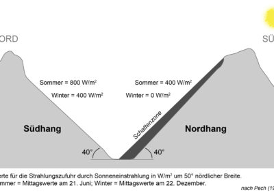 Abb. 2: Schematische Darstellung der Variabilität der eintreffenden Sonneneinstrahlung in Abhängigkeit der Hangexposition (angepasst nach Pech, 1998).