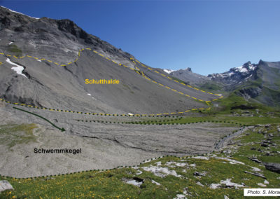 Abb. 6: Schutthalde am Fusse des Faverges-Kamms (Vallon de la Tièche, VS). Im Vordergrund nimmt ein Schwemmkegel einen Teil der Abflachung ein (grün).