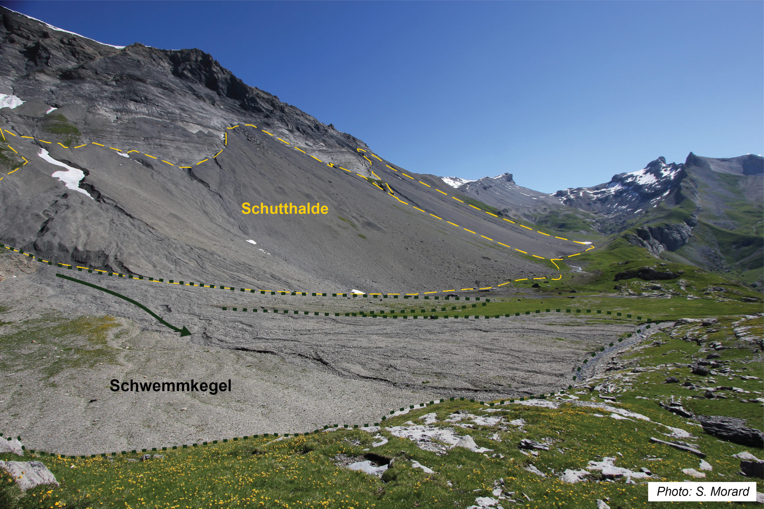 Dabei lösen sich meist sehr kantige Bruchstücke, sogenannter Frostschutt, deren Grösse je nach Frostintensität, Bruchdichte und Gesteinsart variiert. Je nach Gesteinsart und Struktur des Massivs können die Bruchstücke unterschiedliche Formen annehmen (kantige Blöcke, Schuppen, Blätter, Plättchen, Splitter usw.) (Abb. 3). Das Vorherrschen der Frostsprengung verleiht dem Relief eine scharfkantige Erscheinung (Abb. 4), die im Gegensatz zu den eher abgerundeten und polierten Reliefs steht, die durch das Vorherrschen der Gletschererosion entstehen (siehe Abschnitt Glazialmorphologie). Am Fusse der Felswände bildet die Akkumulation von Blöcken und Gesteinsschutt aufgrund der Frostsprengung und des anschliessenden gravitativen Transports Schuttkegel (linearer Schutteintrag in Steinschlagrinne, konvexe Form) oder Schutthalden (flächiger Schutteintrag, eher planare, hangparallele Form) mit einer durchschnittlichen Neigung von etwa 35° (Abb. 5 & 6). Schuttkegel und -halden sind eine der am weitesten verbreiteten Ablagerungsformen des alpinen periglazialen Prozessbereichs (siehe Factsheet Permafrost 5.1).