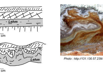 - Es ist auch denkbar, dass durch Kryoturbationsbewegungen Konvektionszellen im Boden entstehen, die zu einer Sortierung des Materials führen. Bei der Kryoturbation handelt es sich um einen Prozess, bei dem es aufgrund von Frost-Tau-Wechseln zu in-situ-Verformungen kommt (Abb. 11). Die Wasserrückhaltekapazität hängt von der Beschaffenheit des Materials ab, was sich wiederum beim Voranschreiten der Gefrierfront in sehr unterschiedlichen Materialausdehnungen äussert. So neigt der stark frostanfällige Lehm dazu, in andere Materialien (z. B. wenig frostanfällige Kiese, siehe Factsheet Permafrost 2.2) hineingedrückt zu werden, was zu kleinen Falten (Kesselformen) in den obersten Bodenschichten führt.