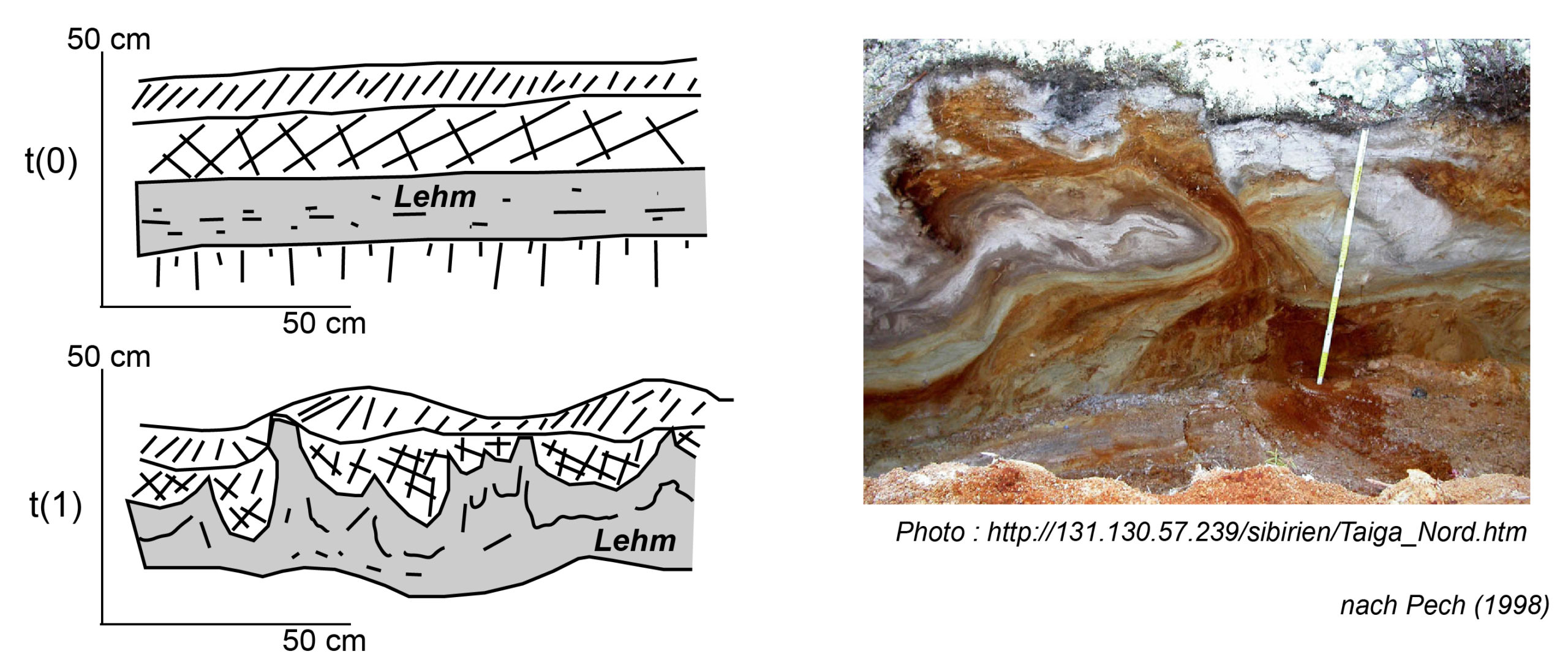 Abb. 11: Schematische Darstellung der Kryoturbation. Das Foto stammt aus der sibirischen Taiga (angepasst nach Pech, 1998).