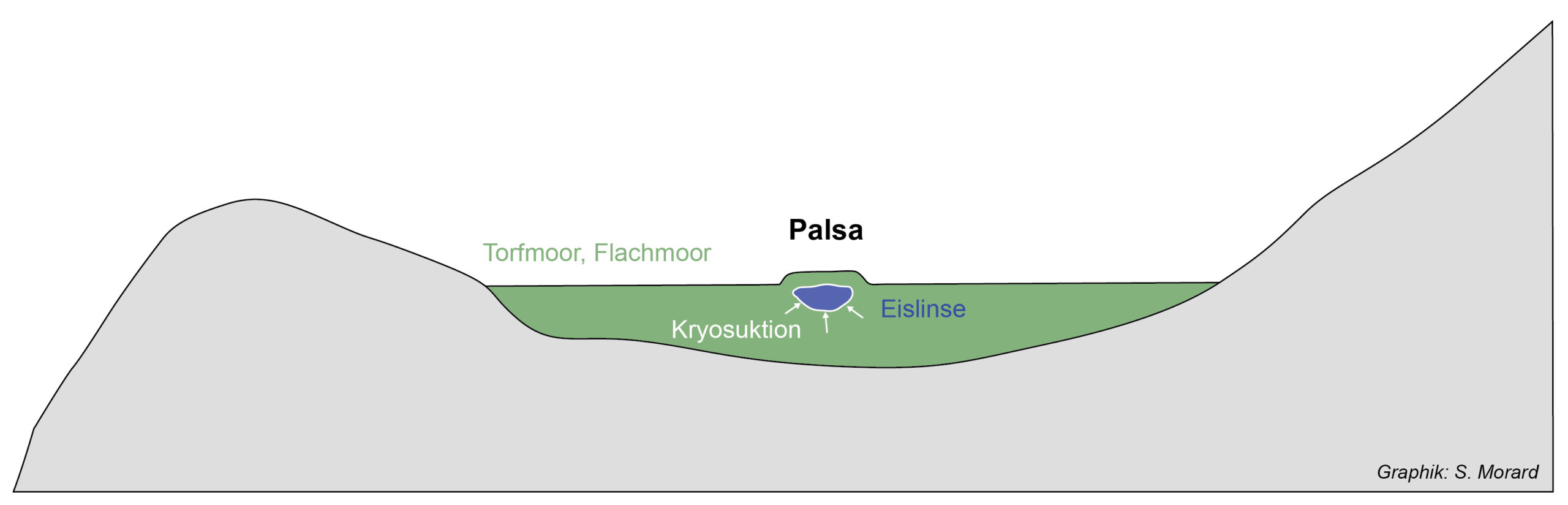 Abb. 13: Schematische Darstellung eines Palsas, welcher aufgrund der Bildung einer Eislinse entstanden ist. Die Geländekonfiguration mit einem Flachmoor ähnelt derjenigen des Mineralpalsas von Faverges (Abb. 15).