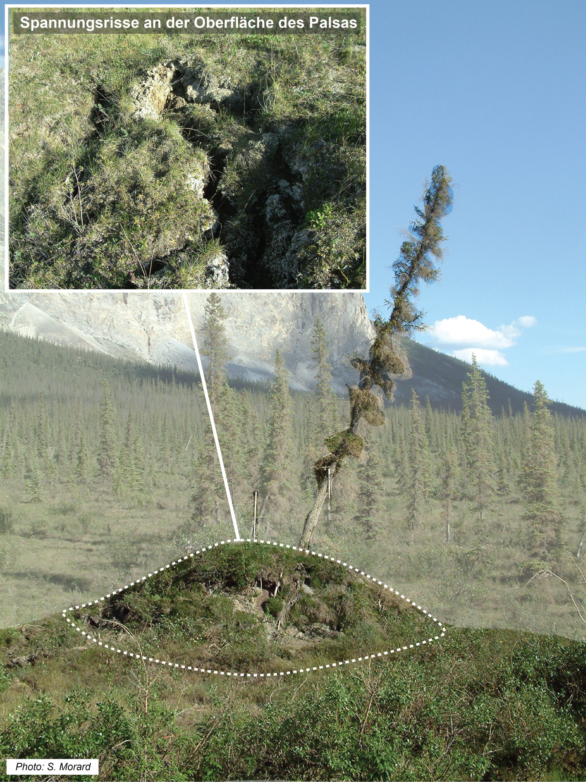 Abb. 14: Etwa 1.5 Meter hoher Palsa mit einem Durchmesser von 3 Metern in den borealen Wäldern Alaskas. Oben auf dem Palsa sind Spannungsrisse sichtbar (Brooks Range, Alaska). Um den Palsa besser erkennbar zu machen, ist der Hintergrund auf dem Foto transparent dargestellt.