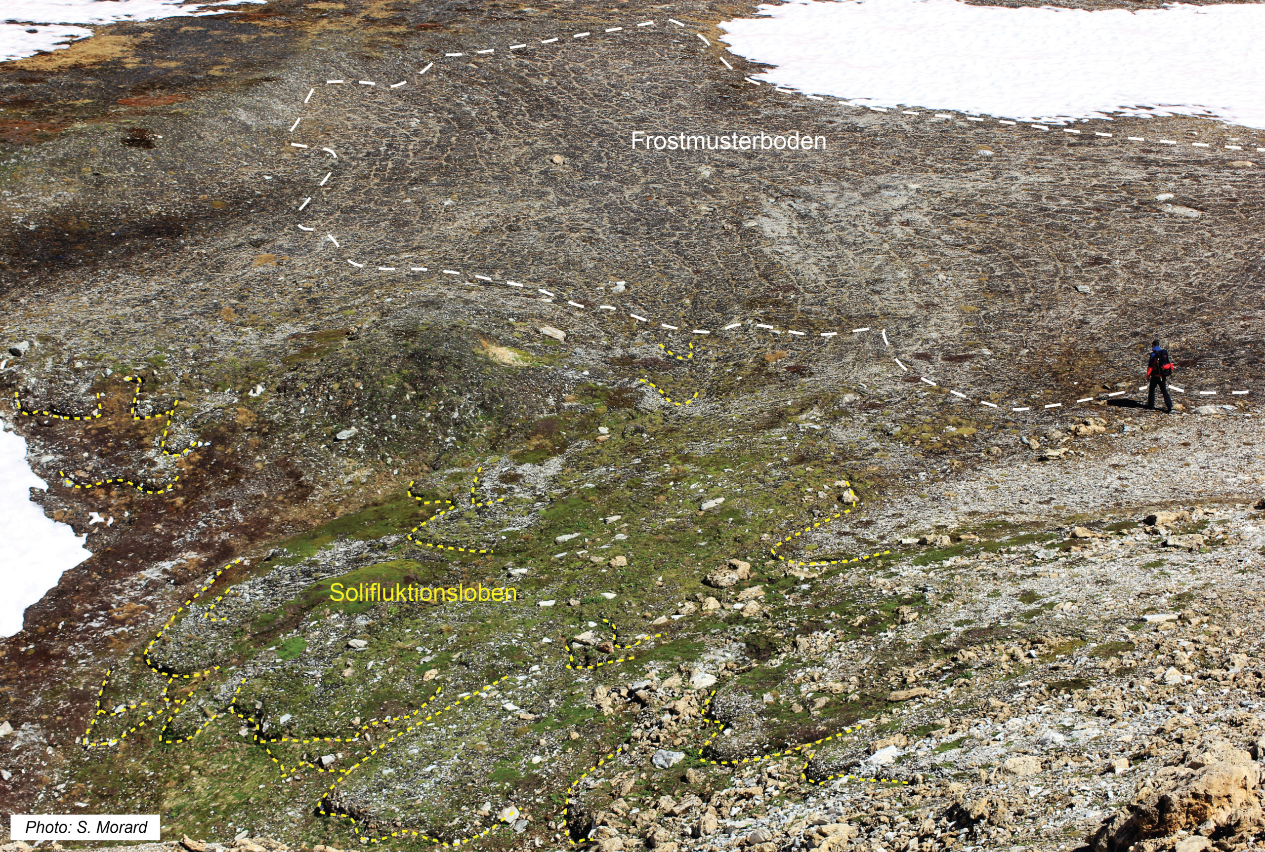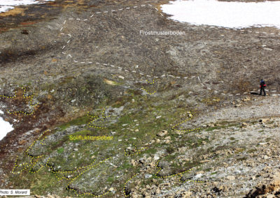 An um einige Grad geneigten Hängen gehen die Polygone in gestreifte Frostmusterböden über, die an der Oberfläche aus einer Abfolge grosser Bänder aus feinem Material bestehen, die durch Steinstreifen getrennt sind und typische Muster der Solifluktion aufweisen (Abb. 6). Im periglazialen Gebiet sind auch noch andere Strukturen anzutreffen (Felder aus aufrechten Steinen, Steinpflästerung usw.).