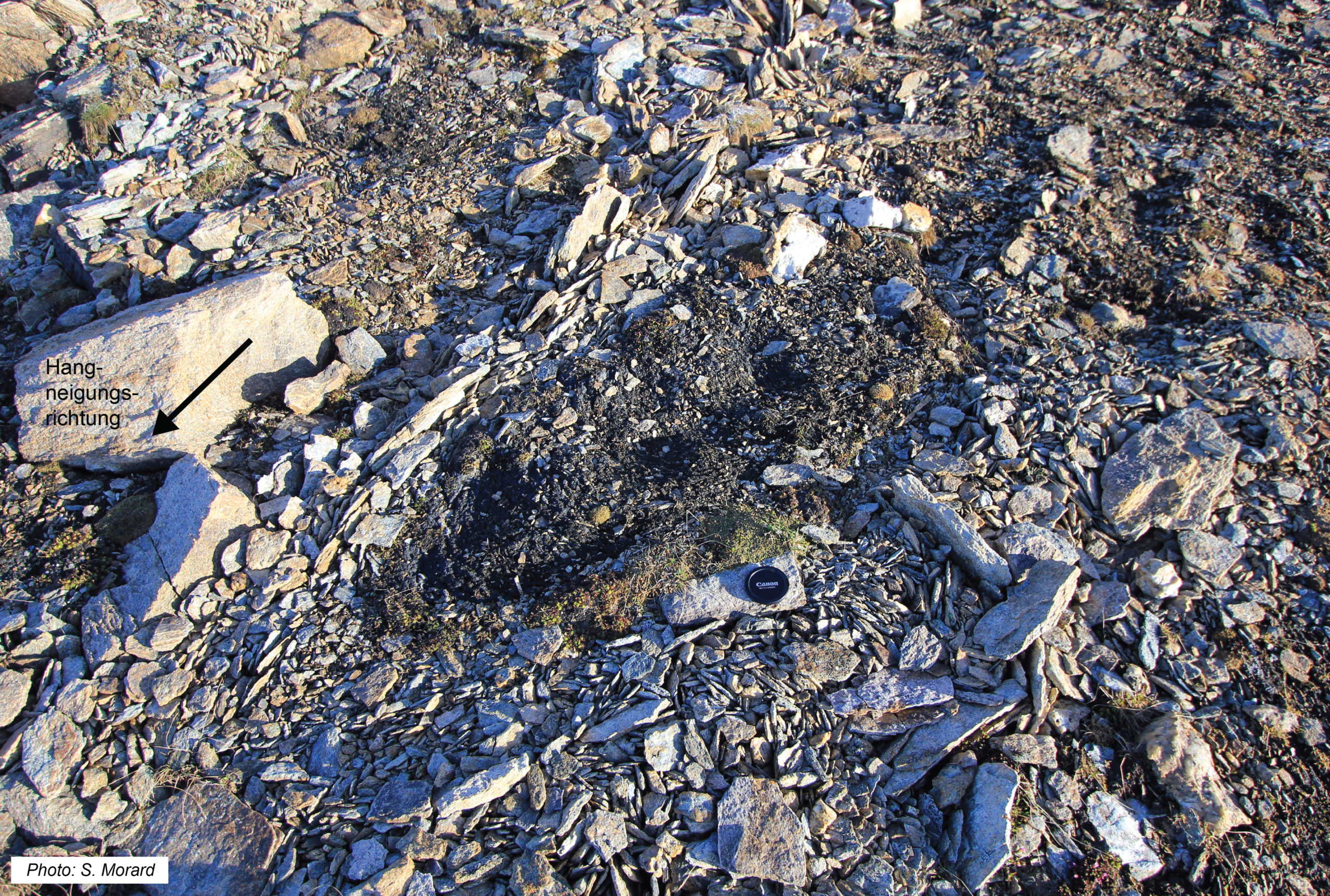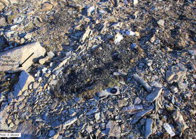 Abb. 6: Gestreifter Frostmusterboden, umgeben von Feldern mit aufrechten Steinen. Die an der Vorderseite des gestreiften Frostmusterbodens (unten links) gelegenen aufrechten Steine haben sich nach einem für die Solifluktion typischen Muster in Hangrichtung aufgereiht (Vallon de Réchy, VS).