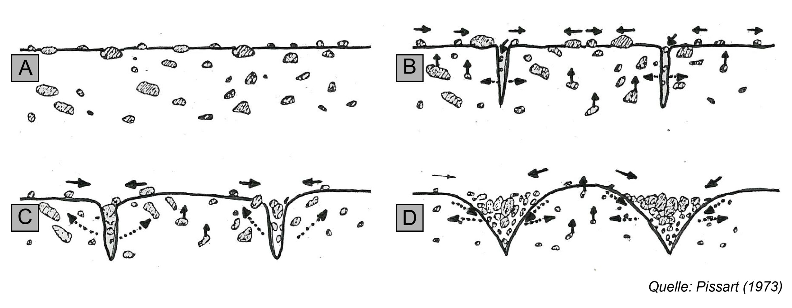Abb. 7: Hypothesen zur Bildung von kleinen Frostmusterböden im Hochgebirge auf der Grundlage durchgeführter Experimente. A: Hebung der Steine durch Frost; B: Öffnung von Kontraktionsrissen; C und D: Aufwölbung in der Mitte und Verlagerung der Steine durch Eisnadeln an der Oberfläche (Quelle: Pissart, 1973).