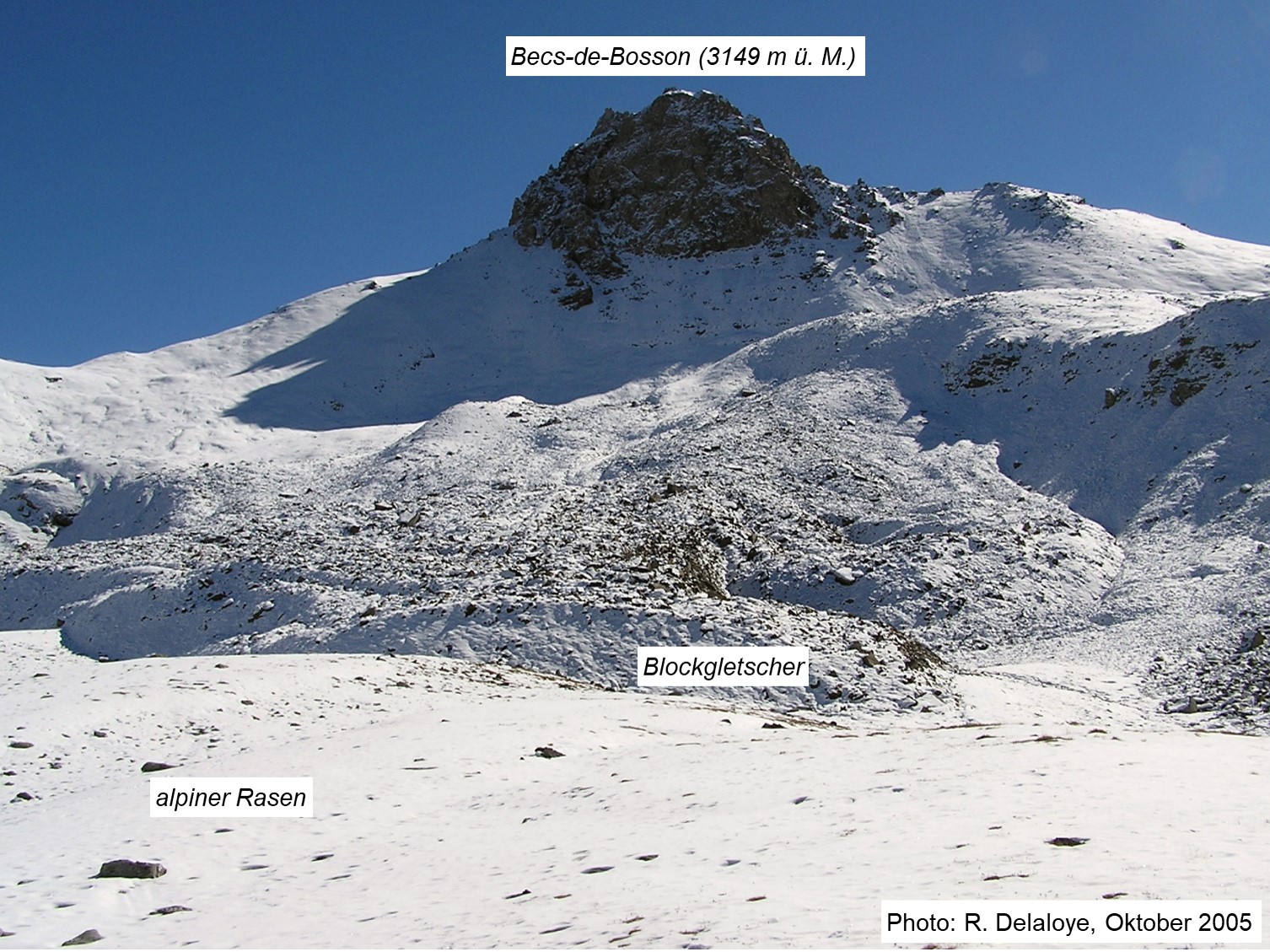 Abb. 2: Unterschiedliche Schneeverhältnisse zwischen der steilen Felswand der Becs-de-Bosson (im Schatten), der rauen Oberfläche des Becs-de-Bosson Blockgletschers und der glatten Oberfläche eines alpinen Rasens (im Vordergrund) (Vallon de Réchy, VS).