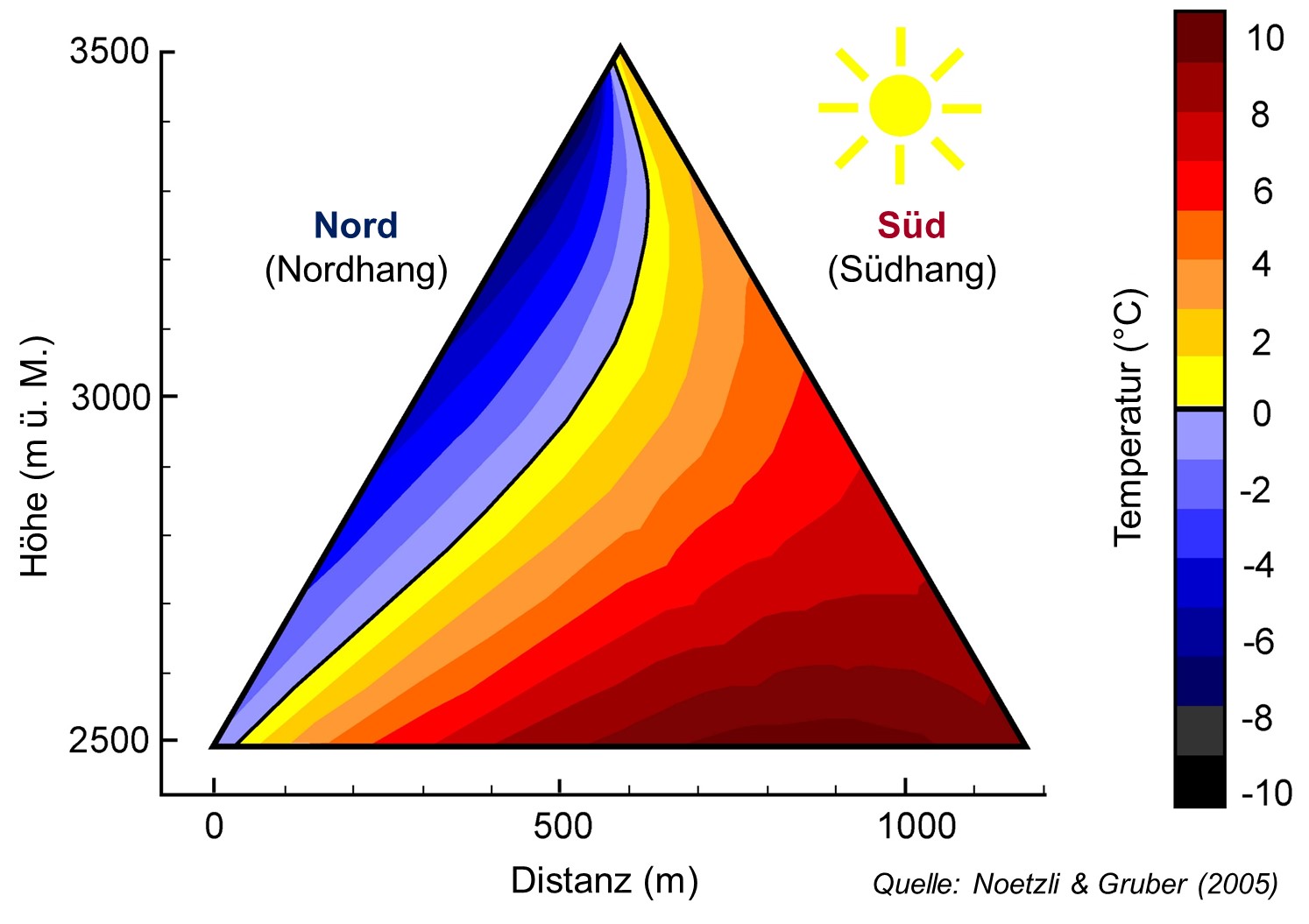 - Die Sonneneinstrahlung (kurze Wellenlängen) ist der Hauptfaktor für die Erklärung der grossen kleinräumlichen Temperaturunterschiede im (Hoch-)Gebirge. Die Hangausrichtung (Exposition) spielt dabei eine grosse Rolle: Das Temperaturregime unterscheidet sich stark zwischen sonnigen Hängen (südexponierte Hänge in den Alpen) und solchen, die die meiste Zeit im Schatten liegen (nordexponierte Hänge in den Alpen) (Abb. 3). Auf der Aiguille du Midi (Mont-Blanc-Massiv) wurden auf gleicher Höhe zwischen Felsoberflächen der Süd- und der Nordseite Temperaturunterschiede von 8 °C gemessen. Von den sonnigen zu den schattigen Hängen stellt sich ein (horizontaler) Wärmefluss durch Konduktion ein. Dieser bestimmt unter anderem die Dicke des Permafrosts innerhalb eines Bergmassivs (Abb. 3). Der geothermische Wärmefluss spielt hierbei nur eine vernachlässigbare Rolle. Aufgrund der unterschiedlichen Formen der Felsgrate und manchmal auch aufgrund von Gletschern sind die Temperaturverhältnisse im Inneren eines Bergmassivs oft viel komplexer als das in Abbildung 3 dargestellt ist.