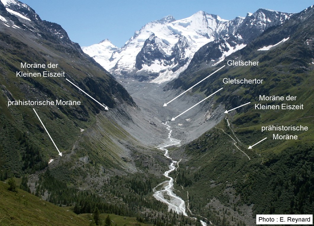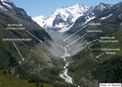 Das Gletschervorfeld ist das Gebiet direkt unterhalb der Gletscherzunge, das sowohl von glazialen, gravitativen und fluvioglazialen als auch von glaziolakustrinen Prozessen beeinflusst wird. In den Alpen wird das (geomorphologisch dynamische) Gletschervorfeld durch die Moränen der Kleinen Eiszeit (1350-1850 n. Chr.) abgegrenzt (Abb. 2). Die Fläche der Gletschervorfelder nimmt derzeit aufgrund des Rückzugs der Gletscher durch den Klimawandel zu.