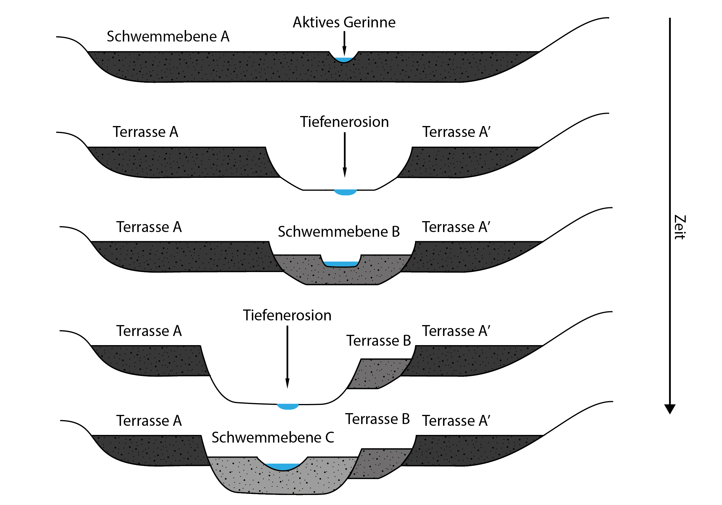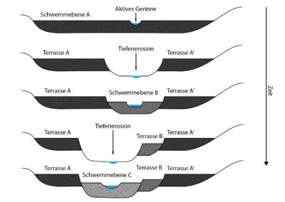 Man spricht von fluvioglazialen Prozessen, wenn glaziale Ablagerungen durch Gletscher-Schmelzwasser umgelagert werden. Der von diesen Prozessen betroffene Bereich des Gletschervorfelds wird Sander genannt (vom isländischen Begriff  “sadur” für «Sand»). Es handelt sich dabei um eine fluvioglaziale Schwemmebene, die sich unterhalb eines Gletschers befindet und den gesamten oder einen Teil des Gletschervorfelds einnehmen kann (Abb. 3). In den Polarregionen ist der Sander oft sehr gross, während er im Vorfeld von Gebirgsgletschern auf wenige hundert Quadratmeter reduziert sein kann. Aufgrund der stark schwankenden Abflüsse des proglazialen Schmelzwasserbachs und der grossen Mengen an Sedimenten, die mobilisiert werden können, ist der Gerinneverlauf von fluvioglazialen Schwemmebenen (Sandern) in der Regel verzweigt (Abb. 4). Durch den Rückzug des Gletschers und/oder Schwankungen der Abflussmengen und der Sedimentlast kann der Sander eingetieft werden, was zur Bildung von Terrassen führt. Dasselbe gilt weiter unten in den Tälern, wo die ursprüngliche postglaziale Sedimentverfüllung in der Regel später erodiert wird, wodurch eine sogenannte fluvioglaziale Terrasse entsteht (Abb. 5), die gegenüber der Höhe des heutigen Flussbetts und gegenüber den in die fluvioglaziale Terrasse eingeschnittenen, sogenannten alluvialen Terrassen (z. B. im Saane-Tal, VD/FR) deutlich höher liegt (Abb. 6).