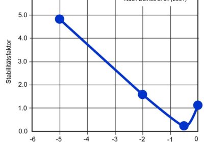 Abb. 2: Vorhergesagte Änderungen der Stabilität einer Felswand, deren Risse mit Eis gefüllt sind, bei einer Neigung von 70° und einer Diskontinuität mit einer Neigung von 40°. Wenn der Sicherheitsfaktor grösser als 1,0 ist, ist die Felswand stabil. Die Erwärmung des Eises führt zu einer Abnahme des Stabilitätsfaktors, mit einem Minimum bei einer Temperatur von -0.5°C (angepasst nach Davies et al., 2001). Diese Grafik legt somit nahe, dass ein Felshang aus zerklüftetem Gestein stabil ist, wenn sich kein Eis in den Spalten befindet (>0°C) und wenn das Eis in den Spalten eine niedrige Temperatur hat. Die Felswand wird instabil, wenn sich das Eis erwärmt (Quelle: Davies et al., 2001).