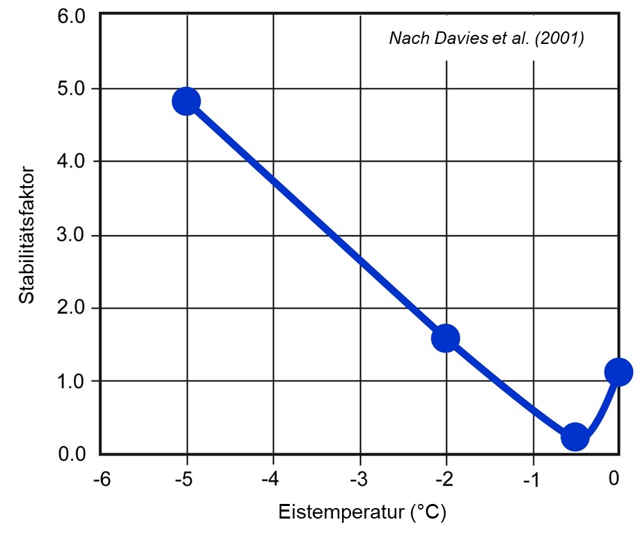 Die Stabilität von Felswänden, deren Risse mit Eis gefüllt sind, wird sehr stark von der Temperatur beeinflusst. Laborversuche zeigen, dass bei einer Temperatur der Gesteinsmassen knapp unter dem Gefrierpunkt (zwischen -1,5 und 0 °C) deren Stabilität abnimmt und die Steinschlaggefahr zunimmt (Abb. 2). Wenn kalter Permafrost temperiert wird, kommt es zu einer vorübergehenden Destabilisierung. Bereiche mit temperiertem Permafrost sind daher anfälliger für Felsstürze, während komplett eisfreie Felswände oder Felswände bei niedrigeren Temperaturen (kalter Permafrost) stabiler sind.