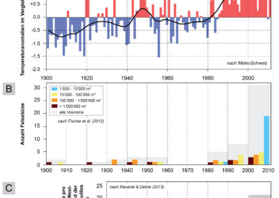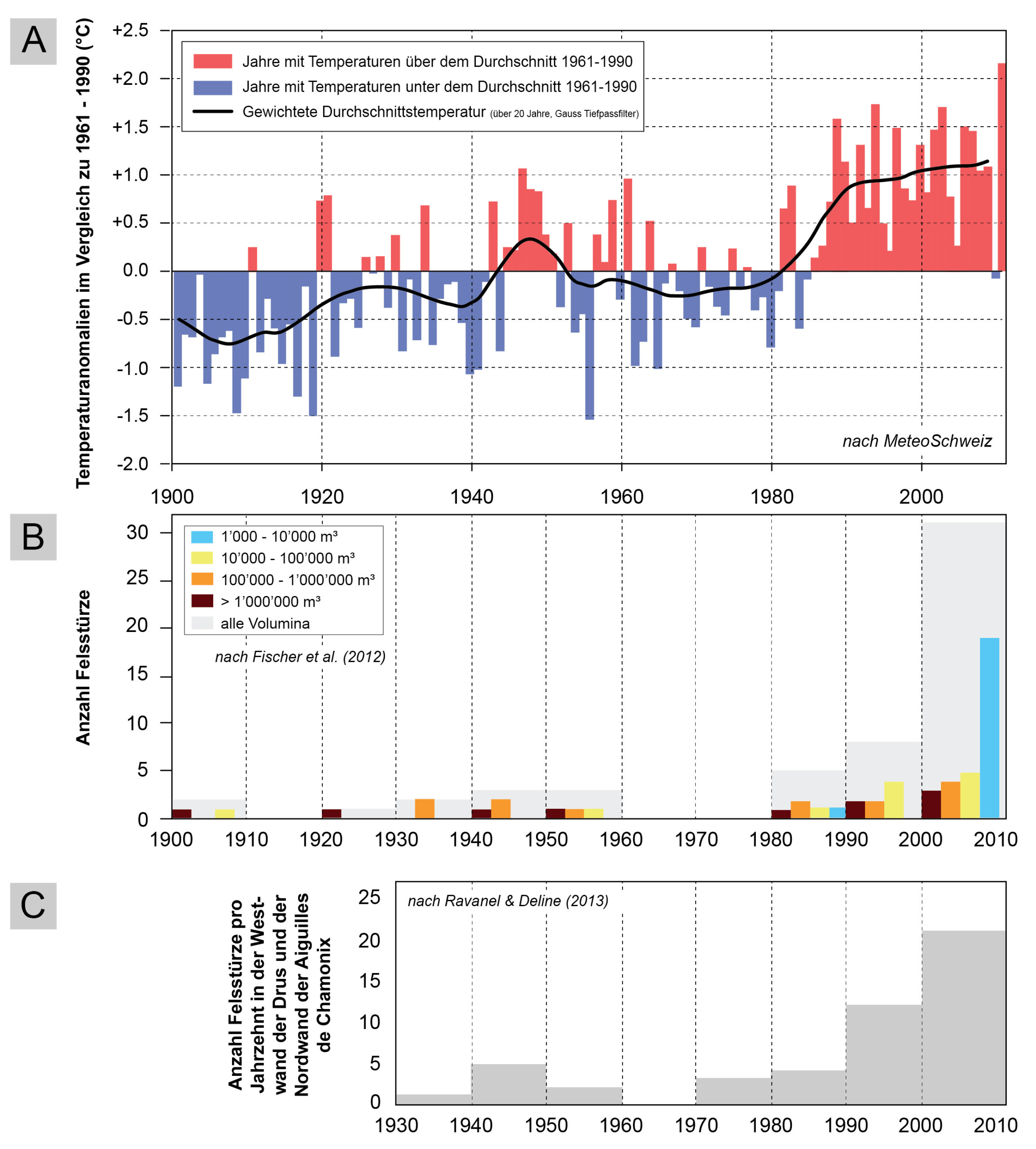 Abb. 1: Entwicklung der Anzahl Felsstürze in den Alpen seit 1900. A: Entwicklung der Abweichung der Lufttemperaturen in der Schweiz oberhalb von 1’000 m ü. M. von der Norm 1961-1990 (klimatische Referenzperiode). B: Anzahl der Felsstürze mit mehr als 1’000 m³ basierend auf historischen Datengrundlagen (angepasst nach Fischer et al., 2012); C: Anzahl der Felsstürze pro Jahrzehnt, die durch Foto-Vergleiche an der Westseite der Drus und der Nordseite der Aiguilles de Chamonix ermittelt wurden (angepasst nach Ravanel & Deline, 2013).