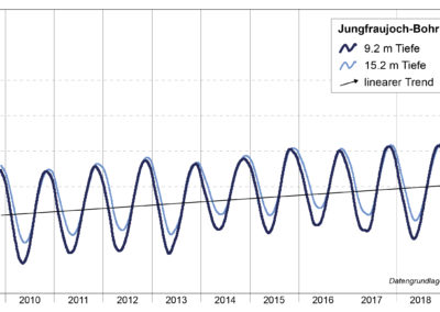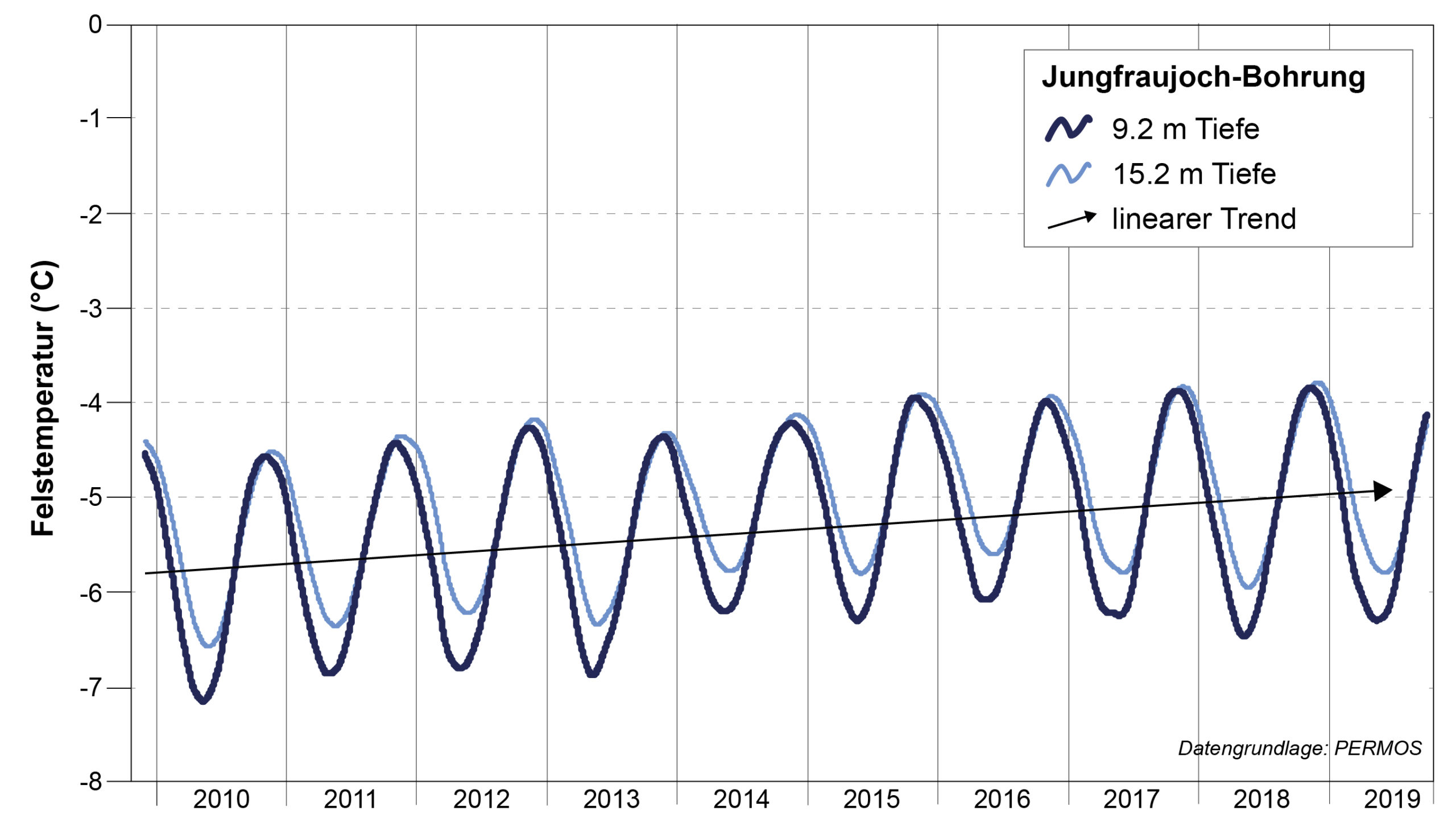 Abb. 5: Temperaturentwicklung in 9.2 und 15.2 Metern Tiefe in einem horizontalen Bohrloch in einer Felswand nördlich des Jungfraujochs auf 3’590 m ü. M. zwischen dem 1. Januar 2010 und dem 30. September 2018. Auch wenn der Permafrost «kalt» ist (zwischen -6 und -5°C), ist über den Messzeitraum in 10 bis 15 Metern Tiefe ein Trend zu einer durchschnittlichen Erwärmung von 0.5°C zu beobachten (Quelle: PERMOS data portal).