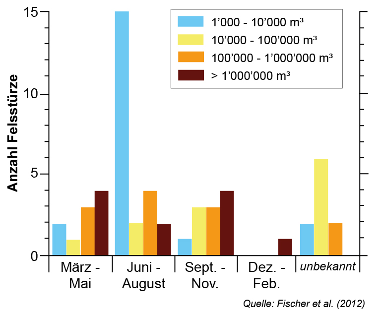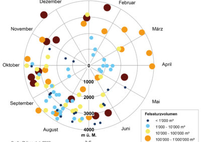 Bei grösseren Felsstürzen (> 100’000 m³) besteht kein Zusammenhang zwischen der Jahreszeit und dem Zeitpunkt des Abbruchs. Diese grossen Felsstürze können das ganze Jahr über auftreten (Abb. 9). Dies lässt sich einerseits durch die von der Sommerhitze benötigte Zeit zur Ausbreitung in die Tiefe und andererseits durch die Berücksichtigung von längerfristig wirkenden Instabilitätsfaktoren erklären (siehe Factsheet Permafrost 3.3).