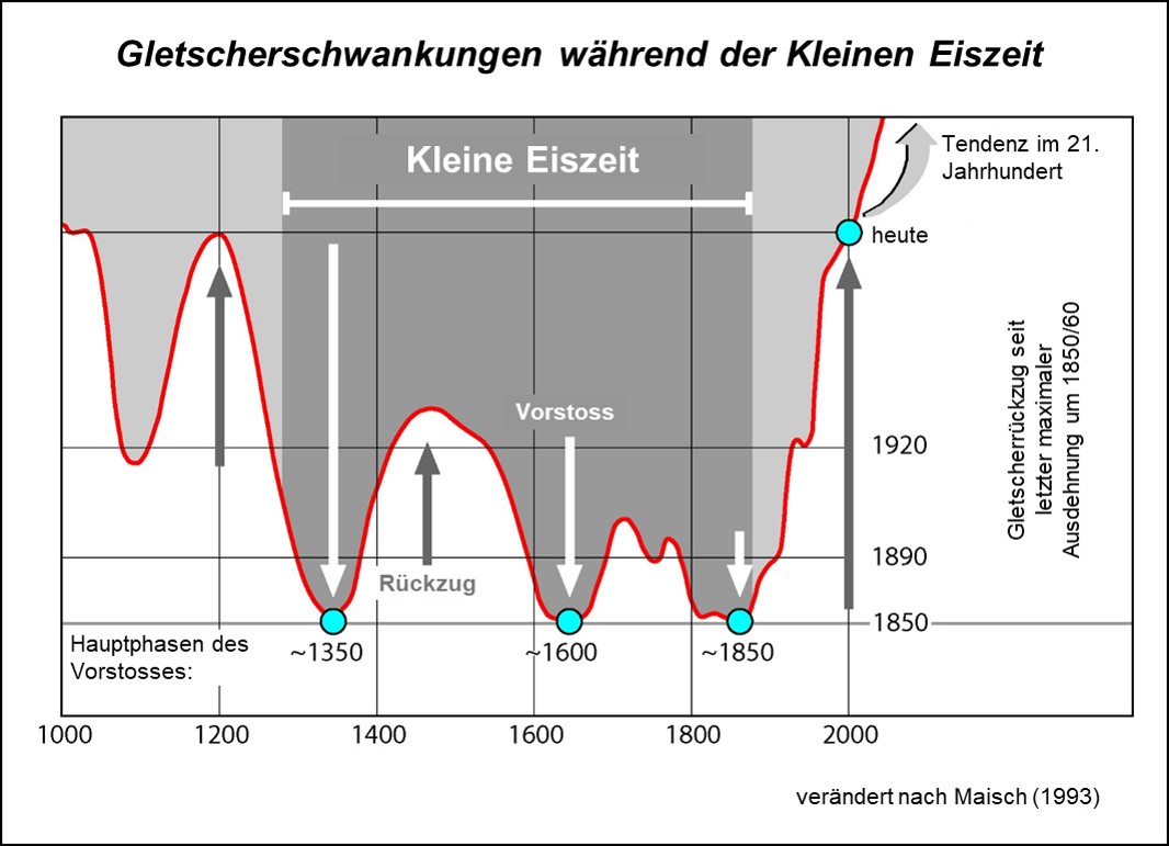 Die Kleine Eiszeit ist durch die markantesten Gletschervorstösse des gesamten Holozäns charakterisiert, mit drei Maxima um 1350, 1600 und 1820/1850 (Abb. 1). Der durchschnittliche mittlere Temperaturrückgang von 0,5 °C, der diese fünf Jahrhunderte kennzeichnete, wurde durch die Kombination von mindestens zwei Faktoren verursacht: Perioden geringer Sonnenaktivität, die als Spörer-Minimum (1460-1550), Maunder-Minimum (1645-1715) und Dalton-Minimum (1790-1820) bezeichnet werden, verbunden mit den von Milankovic identifizierten Orbitalparametern (Factsheet Gletscher 4.2), verstärkt durch die Folgen mehrerer Vulkanausbrüche.