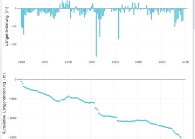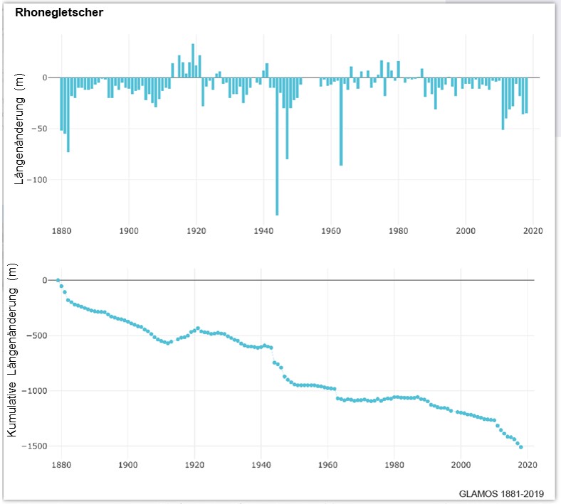 Abb. 2: Die Längenänderungen des Rhonegletschers (Furkapass, VS) sind ein gutes Beispiel für die allgemeine Entwicklung der Schweizer Gletscher seit dem Ende der Kleinen Eiszeit.