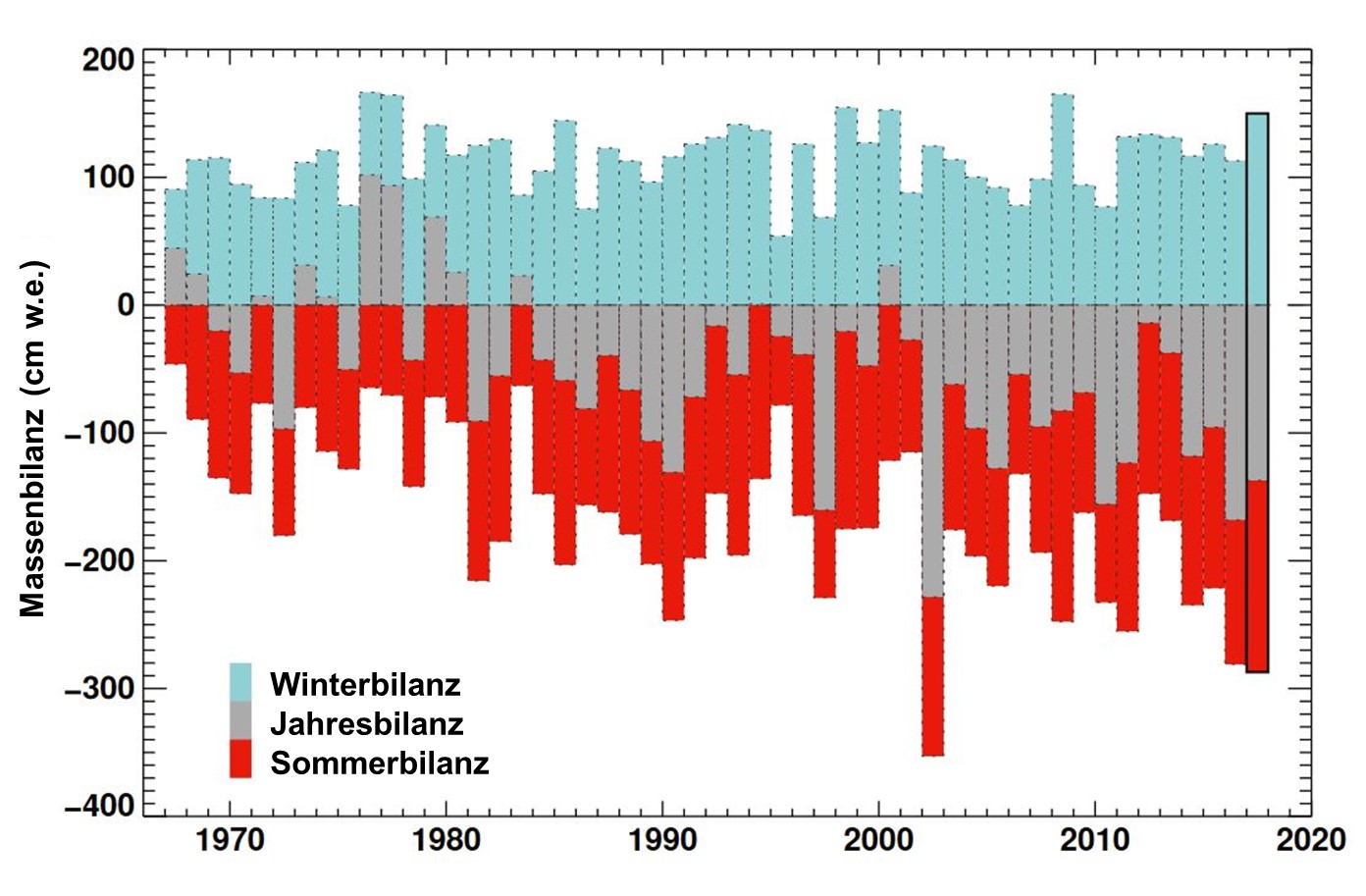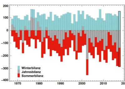 Abb. 5: Entwicklung der winterlichen, sommerlichen und jährlichen Gletscher-Massenbilanz zwischen 1965 und 2018. Die Daten sind anhand der Durchschnittswerte derjenigen Gletscher berechnet, für die das GLAMOS-Netzwerk über die längsten Messreihen verfügt (Allalin, Giétro, Gries, Silvretta; in cm Wasseräquivalent). Das Jahr 2003, das von einer grossen sommerlichen Hitzewelle geprägt war, ist hinsichtlich des Gletschervolumenverlusts außergewöhnlich. Im Zeitraum 2017/2018, der ebenfalls von Sommerhitze geprägt war, wurde der Verlust teilweise durch die grossen winterlichen Schneefälle ausgeglichen.