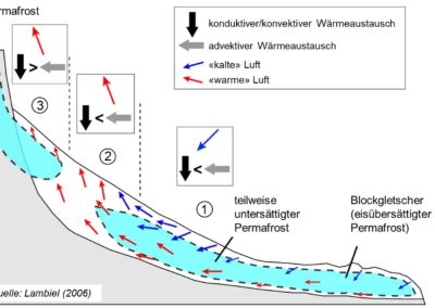 Diese asymmetrische Konfiguration (Vorhandensein von Permafrost in den unteren Bereichen und Fehlen von Permafrost in den oberen Bereichen) scheint den meisten Schutt-/Geröllhalden innerhalb der Gebiete mit alpinem Permafrost gemeinsam zu sein. Verschiedene Erklärungen wurden vorgeschlagen: Erhöhte Schneeakkumulation am Hangfuss durch Lawinen, die das Gelände vor sommerlicher Erwärmung schützen, gröbere Korngrössenverteilung im unteren Bereich, was tiefere Temperaturen begünstigt, komplexe Luftzirkulation innerhalb der Schutt-/Geröllhalden, die eine negative Temperaturanomalie in den unteren Bereichen und eine positive Temperaturanomalie in den oberen Bereichen verursacht (Abb. 6 & 7). Das Fehlen von Permafrost in dafür normalerweise günstigen Höhenlagen zeigt, dass die interne Luftzirkulation, welche für Schutt-/Geröllhalden in niedrigen Höhenlagen (< 2000 m ü. M.) gut untersucht ist (siehe Factsheets Permafrost Kapitel 5), der wichtigste Kontrollfaktor zu sein scheint.