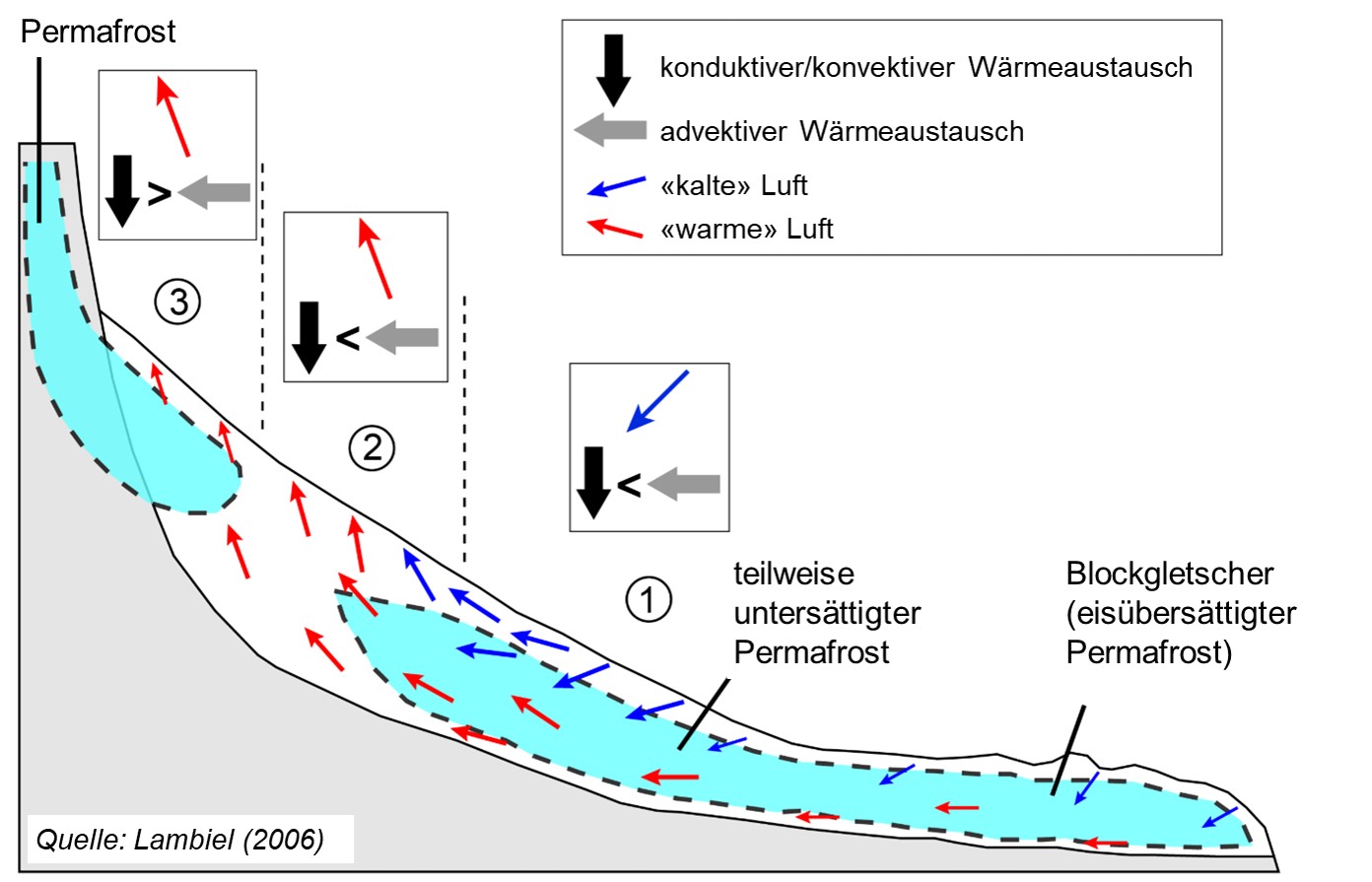Abb. 3: Modell der aufsteigenden Luftzirkulation in einer Schutt-/Geröllhalde innerhalb des Gebiets mit diskontinuierlichem Permafrost. 1: Permafrost wahrscheinlich; 2: Permafrost unwahrscheinlich; 3: Permafrost möglich/unwahrscheinlich (angepasst nach Lambiel, 2006).