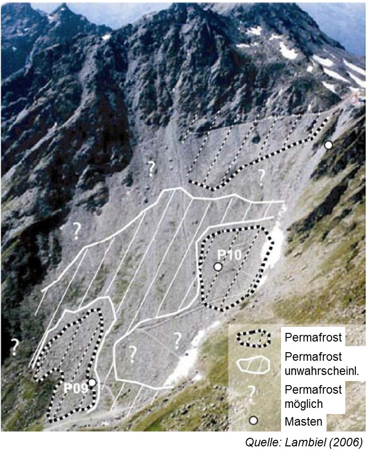 Abb. 4: Vermutete Permafrostsverteilung in einer Schutt-/Geröllhalde