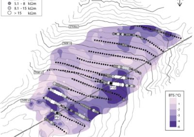 Die Permafrostsverteilung in Schutt-/Geröllhalden weist einen starken Kontrast zwischen bergwärts und talwärts gelegenen Bereichen auf. Im talwärts gelegenen Bereich befindet sich unter einer Schicht aus einer Mischung von großen Blöcken an der Oberfläche und feineren Sedimenten in der Regel eine Schicht aus gefrorenen Sedimenten unterschiedlicher Dicke (5 bis 30 m). Die Auftretenswahrscheinlichkeit von Permafrost nimmt bergwärts ab. In den obersten Bereichen ist das Vorhandensein von Permafrost wieder möglich, hauptsächlich in nordexponierten Schutt-/Geröllhalden oberhalb von etwa 2700 bis 2800 Metern (Abb. 3). Die räumliche Verteilung der drei oben genannten Zonen kann jedoch von einer Stelle der Schutthalde zur anderen stark variieren (Abb. 4 & 5).