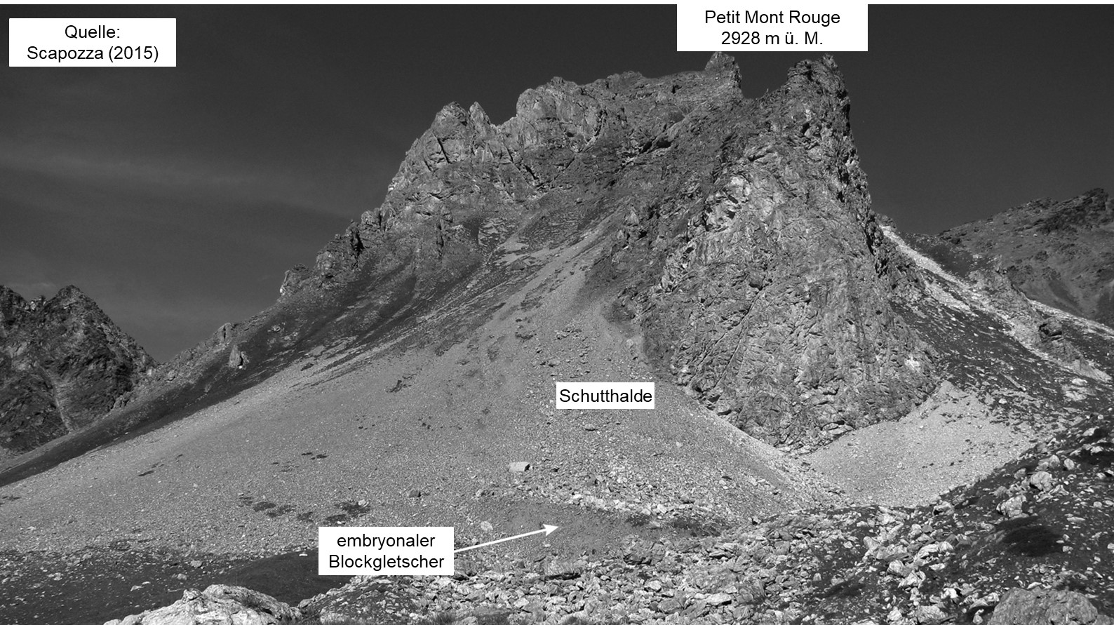 Abb. 6: Schutt-/Geröllhalde und embryonaler Blockgletscher am Petit Mont Rouge (Wallis) (Quelle: Scapozza, 2015).