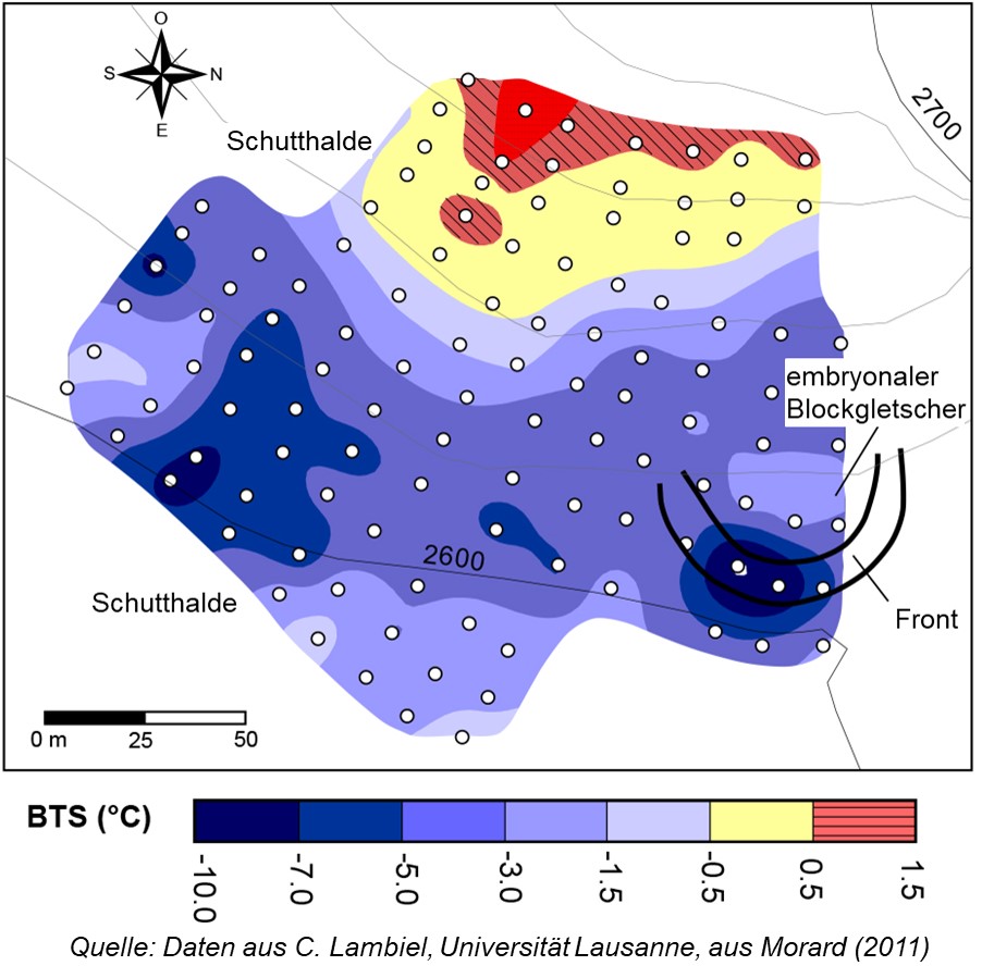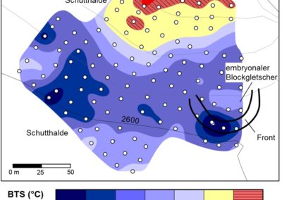 Abb. 7: Die hochgelegene Schutt-/Geröllhalde des Petit Mont-Rouge (Walliser Alpen, 2600 m ü. M.) zeigt eine typische Verteilung der winterlichen Bodenoberflächentemperaturen auf belüfteten Schutt-/Geröllhalden, mit einem starken Kontrast zwischen bergwärts und talwärts gelegenen Hangbereichen. Einfache Kriging-Interpolation von BTS-Messungen vom 2. März 2004 (Daten: C. Lambiel, Universität Lausanne).