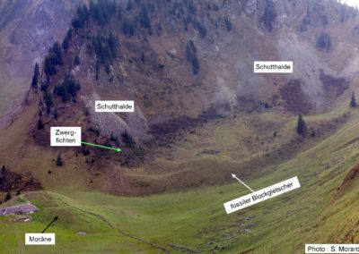 Abb. 2: Der fossile Blockgletscher von Gros Chadoua (Freiburger Voralpen) entstand unterhalb einer breiten Schutthalde. Spätglaziale Moränen sind ebenfalls an diesem Standort zu finden. Im Bereich der Schutthalde und des fossilen Blockgletschers wurden ein Gebiet mit Zwergbäumen, Eiskristalle und starke Kaltluftströme ausgemacht.
