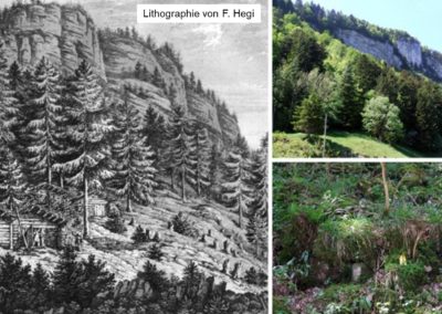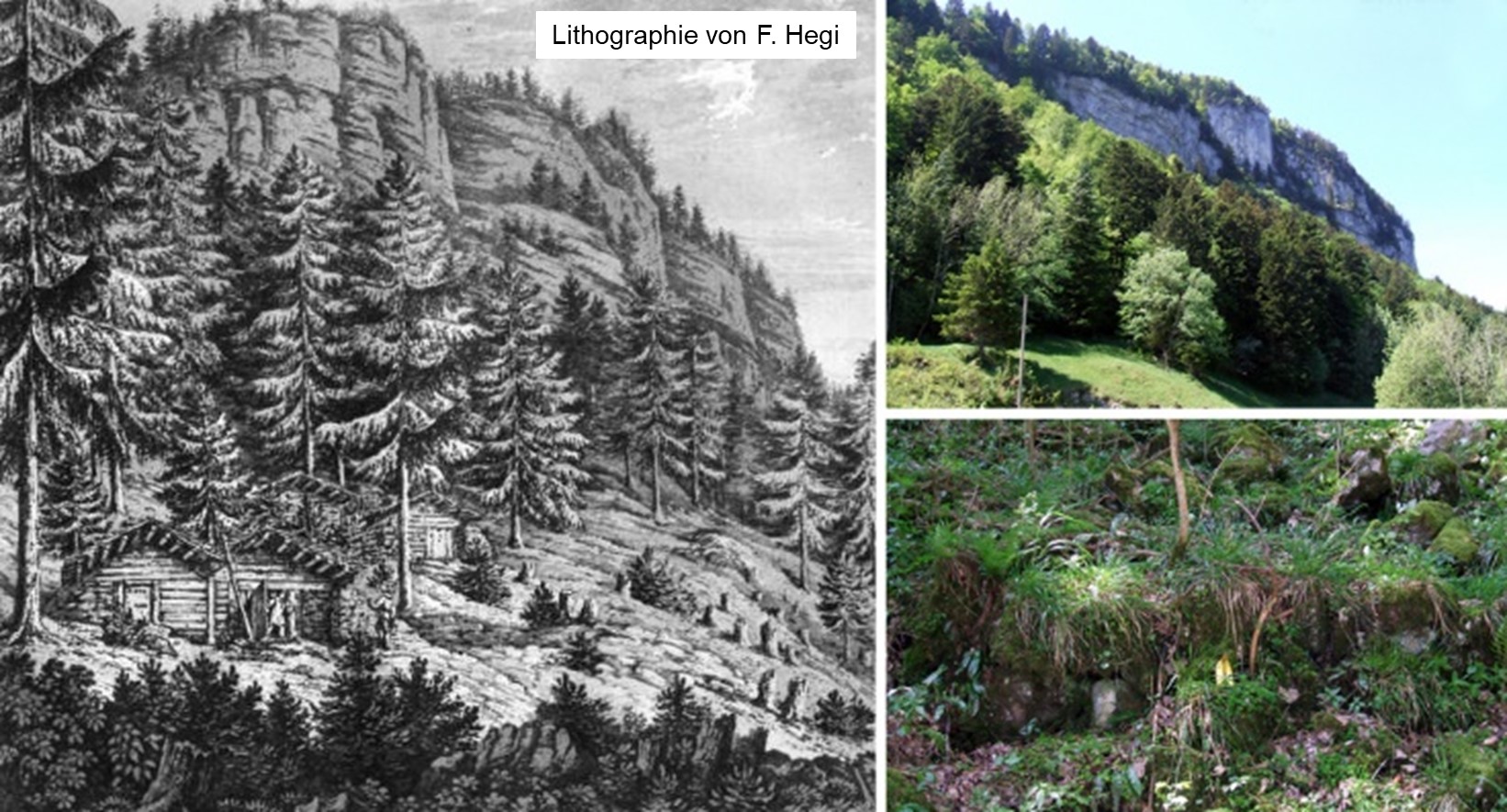 Abb. 3: Milchkeller von Seelisberg (Uri), beschrieben von Ferdinand Keller (1839). Heute sind die Holzhäuser verschwunden, aber niedrige Steinmauern, die ein Quadrat mit einer Seitenlänge von 2 Metern bilden, sind in den unteren Teilen des Schutthaldenhangs noch sichtbar. Es ist möglich, dass die Milchkeller einst an dieser Stelle gebaut wurden.