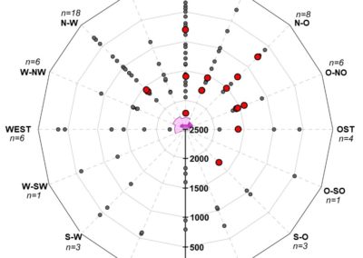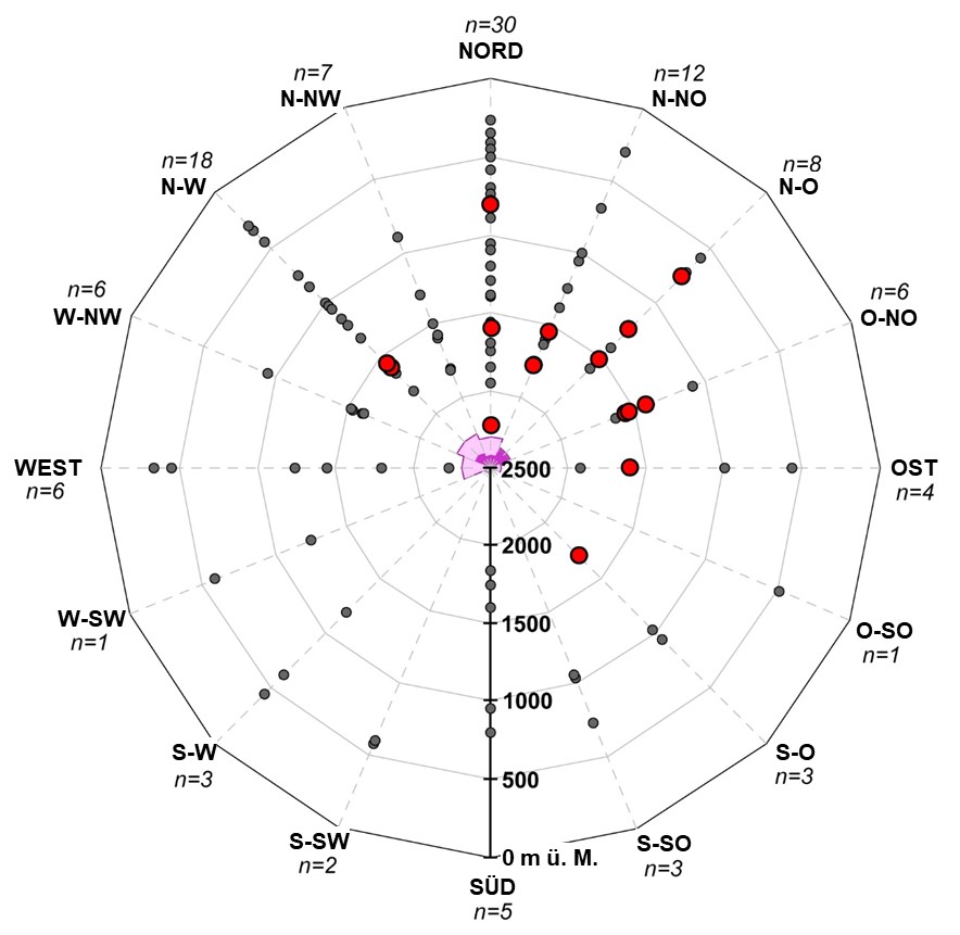 Abb. 5: Verteilung von in der Literatur beschriebenen unterkühlten Schutthalden nach Höhenlage und Exposition. Die roten Kreise zeigen die Lage der Untersuchungsgebiete in der Westschweiz, die in der Dissertation von Morard (2011) und in den Arbeiten von Delaloye (2004), Lambiel (2006) und Dorthe & Morard (2007) vorgestellt wurden. Der hellrosa Bereich in der Mitte des Quadranten zeigt die Verbreitung von diskontinuierlichem Permafrost gemäss dem Modell Haute-Alpes calcaires (Imhof, 1996), der violette Bereich die gemäss dem Modell Entremont (Delaloye & Morand, 1997) definierten Permafrostuntergrenzen. Alle Standorte liegen (weit) unterhalb der regionalen Untergrenze des diskontinuierlichen Permafrosts.