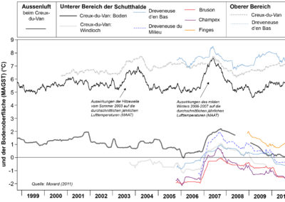 Durch wiederholte Temperaturmessungen nahe der Bodenoberfläche, welche auf verschiedenen unterkühlten Schutthalden durchgeführt wurden – die längste Messreihe am Creux-du-Van begann 1997, konnte einerseits aufgezeigt werden, dass das thermische Regime zwischen den verschiedenen untersuchten Standorten sehr ähnlich ist, und andererseits, dass der entscheidende Faktor für die Entwicklung dieser Standorte die Aussenlufttemperatur während des Winters ist. Längere und sehr intensive Kälteperioden im Winter begünstigen die Bildung von Frost bis tief ins Innere der Schutthalde, wie wiederholte Untersuchungen mit elektrischer Widerstandstomographie am Standort Dreveneuse d’en Bas gezeigt haben (siehe Factsheet Permafrost 5.2). Umgekehrt tragen die Aussenlufttemperaturen im Sommer sowie die Höhe der Schneedecke nur sehr wenig zur Entwicklung des Temperaturregimes von belüfteten, unterkühlten Schutthalden bei, im Gegensatz zu den grobblockigen Sedimentformationen in grosser Höhe (siehe Factsheet Permafrost 1.3). So wurde beispielsweise in den unteren Bereichen der unterkühlten Schutthalden in der Westschweiz nach dem Hitzesommer 2003 keine signifikante Erwärmung des Untergrunds beobachtet (Abb. 1). Im Gegensatz dazu erwärmten sich die mittleren jährlichen Bodenflächentemperaturen in den unteren Bereichen der unterkühlten Schutthalden nach dem milden Winter 2006/2007 um mehr als 1°C (Abb. 1).