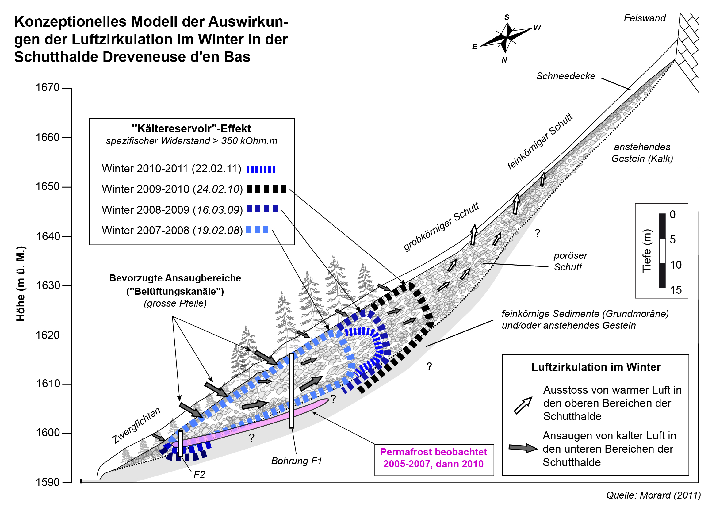 Am Fuss der Schutthalde von Dreveneuse d’en Bas (Abb. 2) konnte in den Jahren 2004-2006 das Auftreten von geringmächtigem, temperiertem Permafrost (0°C) durch Bohrlochmessungen nachgewiesen werden. Ab 2007 taute dieser auf und bildete sich schliesslich ab 2010 infolge der sehr kalten Winter 2009-2010 erneut (Abb. 3). Seit 2013 ist in den Bohrlöchern dieser Schutthalde nur noch saisonaler Frost zu beobachten. Die Dynamik des gefrorenen Bodens in der Schutthalde von Dreveneuse d’en Bas unterscheidet sich somit stark vom Hochgebirgspermafrost. Er kann als «kurzfristiger azonaler Permafrost» (auf Russisch auch «pereletok» genannt) betrachtet werden, dessen Geometrie sich in Abhängigkeit der Aussenlufttemperaturen im Winter von Jahr zu Jahr stark zu verändern scheint.