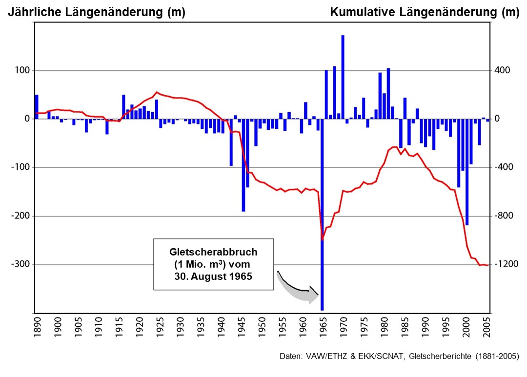 Die letzte kühlere Phase innerhalb der Kleinen Eiszeit begann in den südwestlichen Schweizer Alpen zu Beginn des 19. Jahrhunderts und führte zu einem markanten Massenzuwachs der Gletscher. Diese Periode ist durch einen allgemeinen Vorstoss der Schweizer Gletscher gekennzeichnet (siehe Factsheet Gletscher 4.6). Zu den klimatischen Ursachen kamen die Auswirkungen des Ausbruchs des Tambora-Vulkans in Indonesien im Jahr 1815 hinzu, der das Weltklima beeinflusste, insbesondere im Jahr 1816, das in Europa als «Jahr ohne Sommer» bezeichnet wurde.