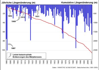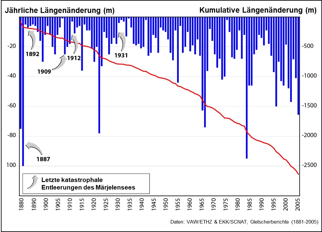 In der Schweiz ist der Giétro-Gletscherseeausbruch (siehe Factsheet Gletscher 6.2) ein bekanntes Beispiel, ebenso wie der Lac des Faverges (Plaine-Morte-Gletscher) oder der Märjelensee. In der Vergangenheit bildete sich der Märjelensee regelmässig am Rand des Aletschgletschers und entleerte sich plötzlich, wodurch die Massa und die Rhone rasch anstiegen (Abb. 6). Zwischen 1813 und 1913 verursachte dieser See 38 katastrophale Hochwasser. Der Rückzug des Aletschgletschers hat die Gefährlichkeit des Märjelensees verringert, der letzte grössere Ausbruch erfolgte 1931.