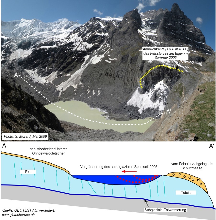 Angesichts der Gefahr einer plötzlichen Entleerung (Abb. 7) werden einige Seen überwacht und künstlich entleert. So wurde die 60.000 m³ grosse, unter Druck stehende Wassertasche des Tête-Rousse-Gletschers (3800 m ü. M.) bei Saint-Gervais in Hochsavoyen seit 2010 mehrmals abgepumpt, um das Volumen zu verringern und mögliche Schäden im Falle eines Ausbruchs zu reduzieren. Auch der supraglaziale See des Unteren Grindelwaldgletschers wurde  überwacht (Abb. 8 & 9). Um grössere Überschwemmungen aufgrund eines Ausbruchs des jährlich wachsenden Sees zu verhindern, wurde 2009 ein 2 km langer Drainagetunnel gebaut (Abb. 10). Er ermöglichte einen gleichmässigeren Abfluss und begrenzte das Volumen des Sees auf 120.000 m³ (im Vergleich zu 2,5 Mio. m³ vor den Bauarbeiten).